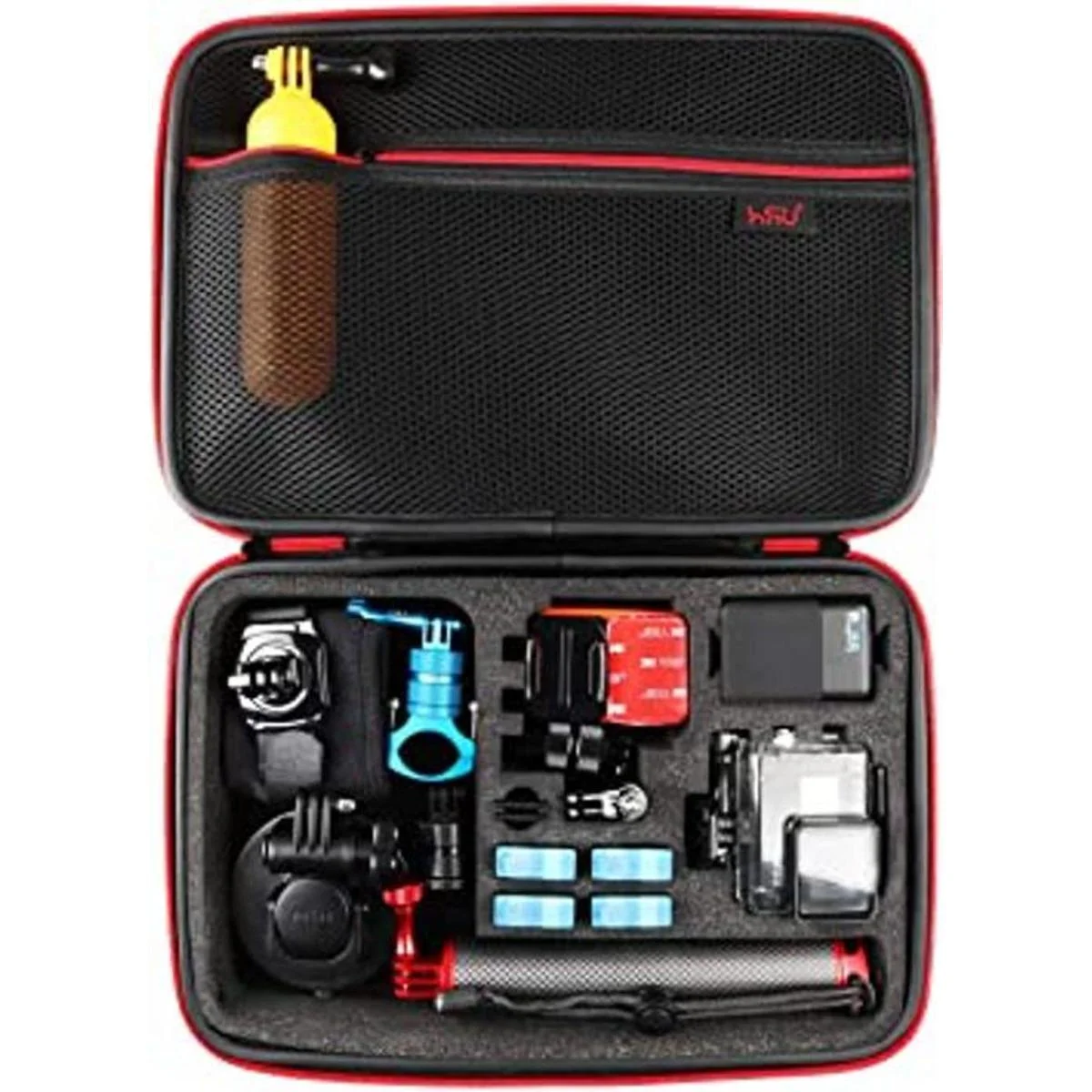 HSU Funda de transporte grande para GoPro Hero 11, 10, 9, Hero 8, 7 negro, HERO6, 5, 4, LCD, negro, plata, 3, 3, 2 y accesorios con asa de transporte interior totalmente personalizable y mosquetón