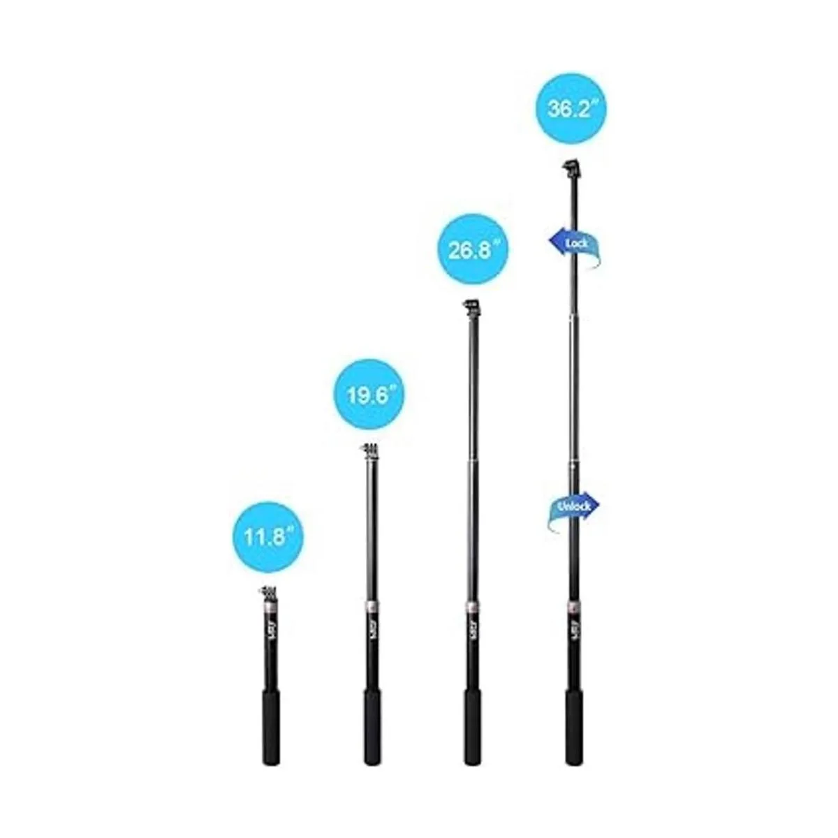 Palo selfie telescópico: permite ajustes rápidos de longitud de 11.8 a 36.2 pulgadas. Cómoda superficie de contacto con agarre de silicona