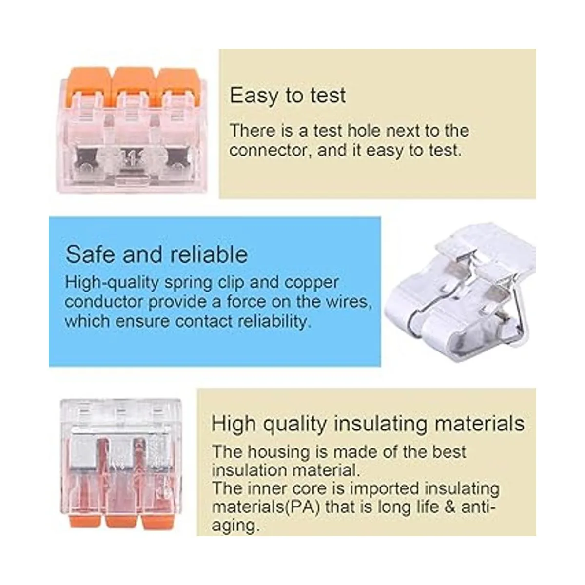 Fácil de usar: no necesitas herramientas para conectar cables, simplemente usa tus manos. Empuja las palancas naranjas a 90 y conecta los cables tira de la carcasa de los cables a 0.350.47 pulgadas y asegúrate de que los cables estén conectados al extremo. No abras la carcasa de los cables demasiado largo y vuelve a poner el clip. Cuando estás haciendo conexión eléctrica, solo necesitas un poco de fuerza para empujar las palancas hacia arriba.
