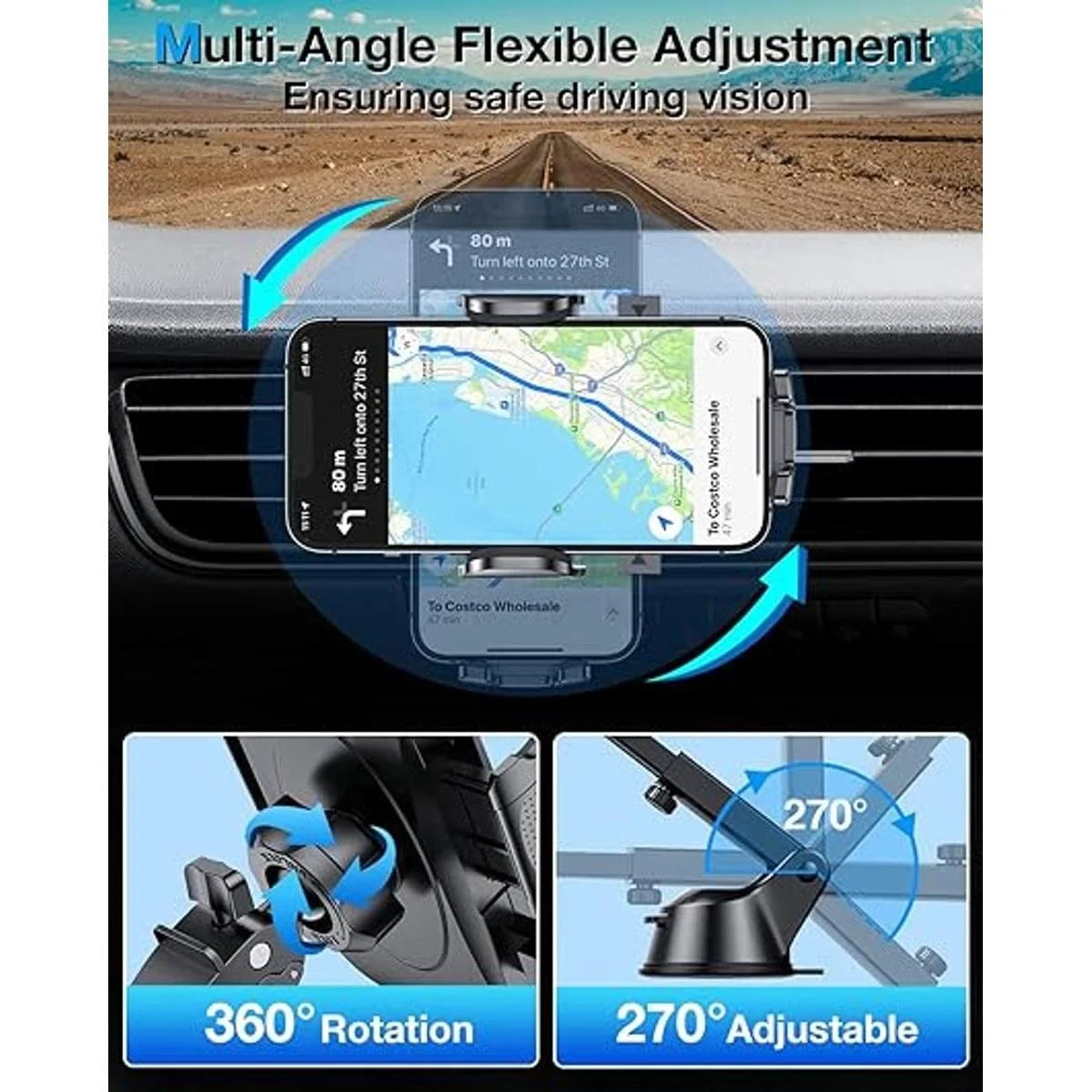 Múltiples ángulos de visión: la rótula ajustable permite una rotación de 360 para ángulos de visión óptimos de tu dispositivo. Brazo telescópico ajustable que se adapta a la longitud deseada de hasta 9.8 in, puedes ajustar la distancia como desees. Disfruta de una experiencia de conducción más segura y relajada mientras colocas tu teléfono en el ángulo perfecto.