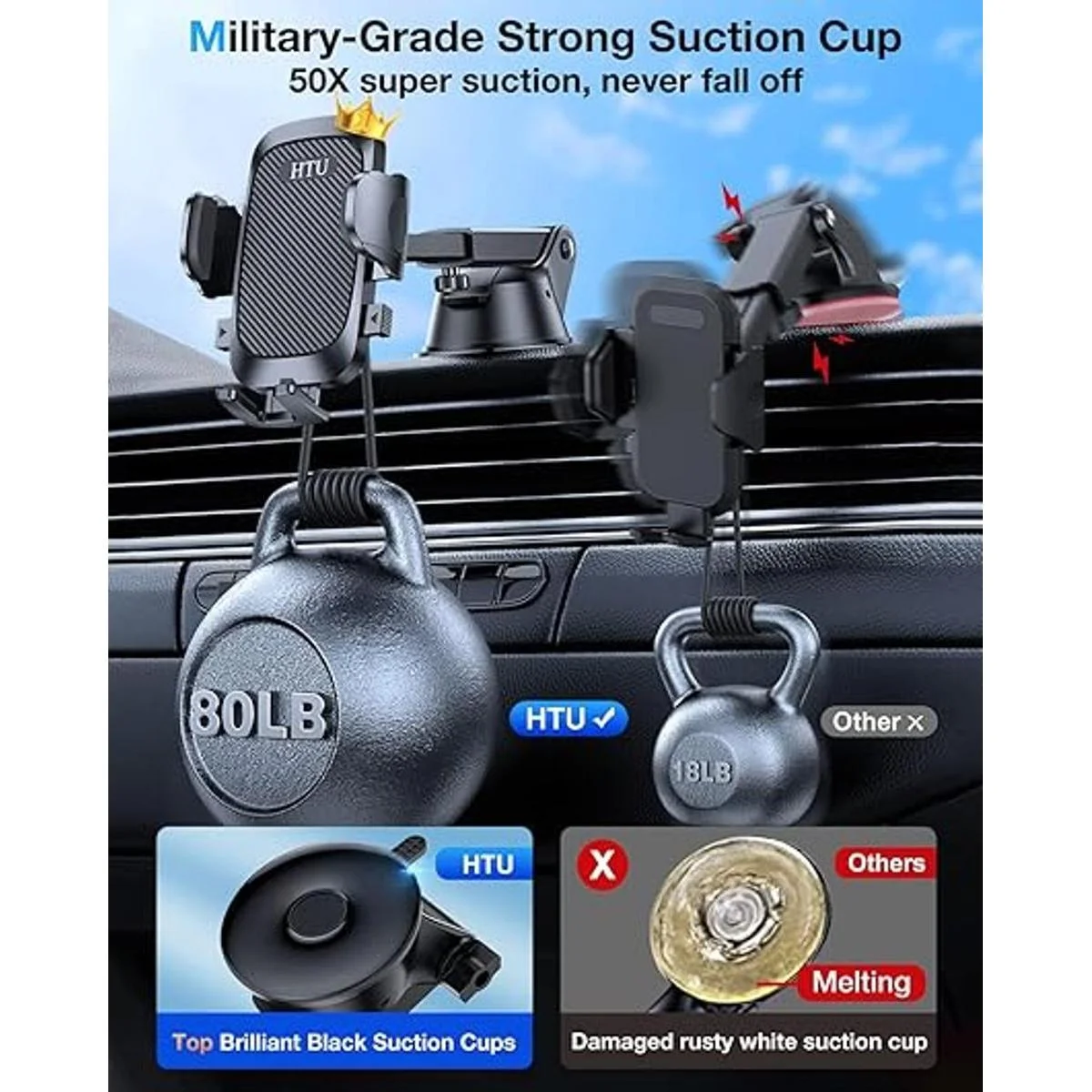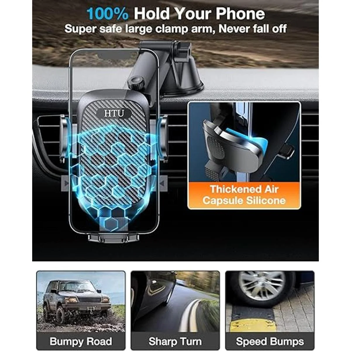 HTU Soporte para teléfono celular para automóvil Potente ventosa nunca se caer Soporte universal para teléfono de automóvil para salpicadero, parabrisas de aire, brazo largo, soporte para teléfono celular, soporte para automóvil, funda gruesa compatible con teléfonos