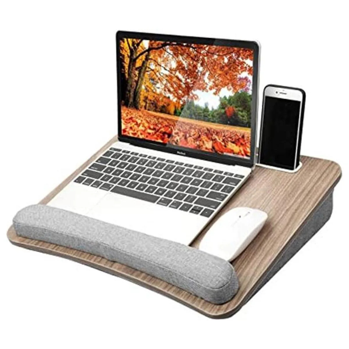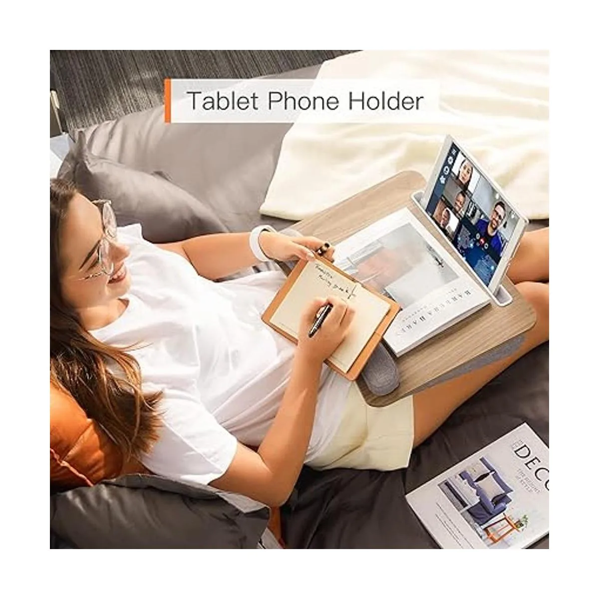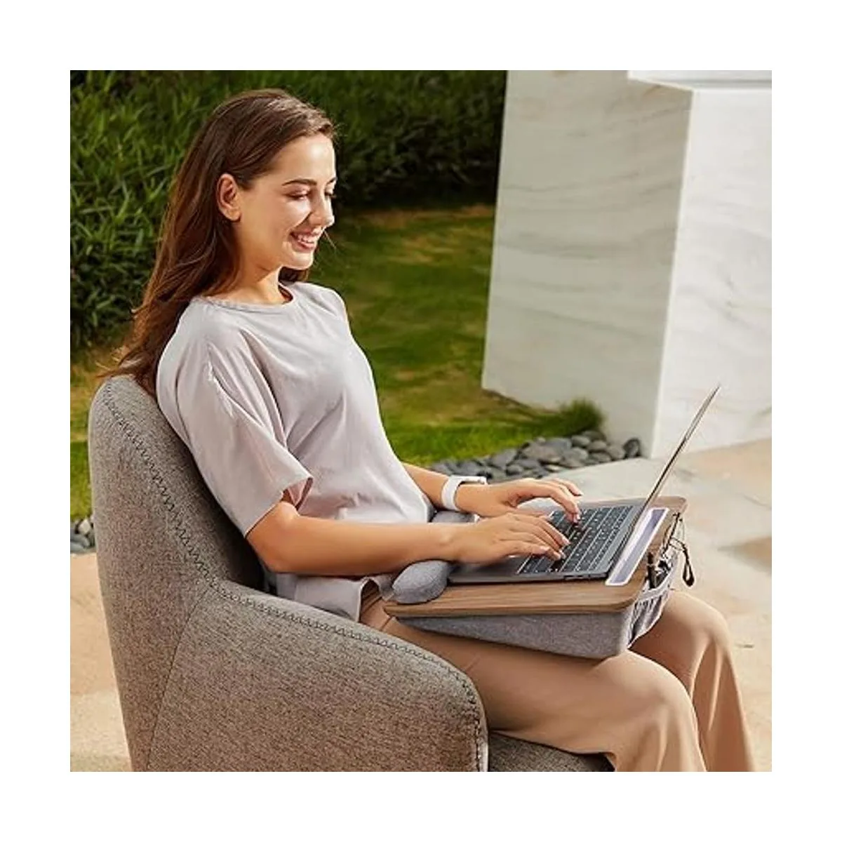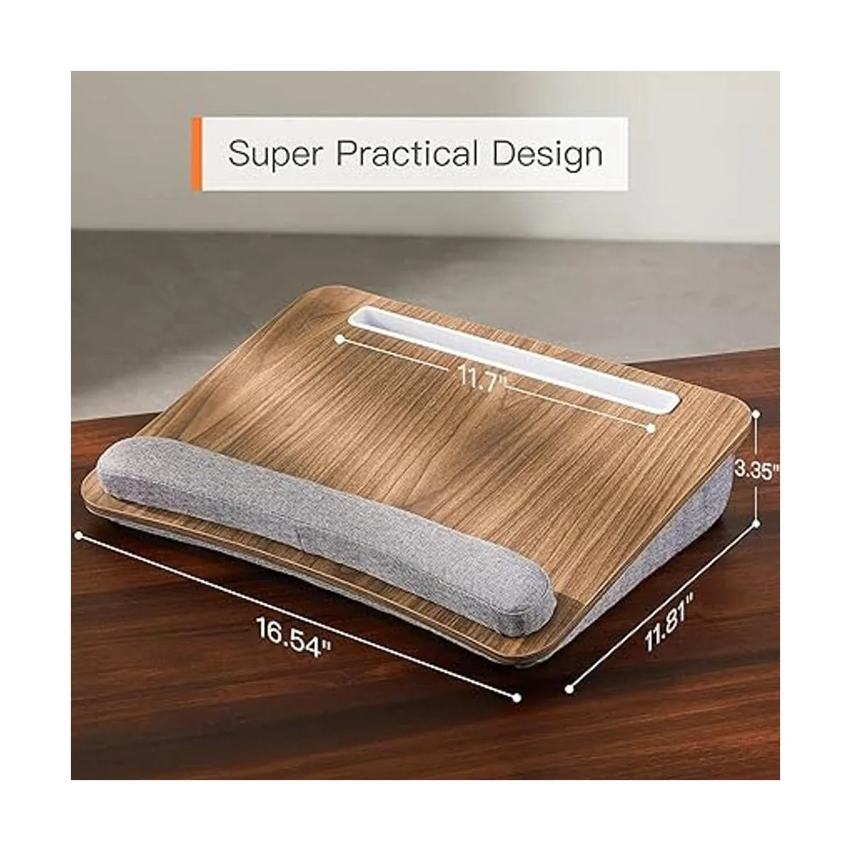 Aspecto elegante: diseñado con una plataforma de grano de madera marrón y almohadilla de espuma cubierta de tela gris que le da al escritorio de regazo un aspecto moderno y atractivo.
