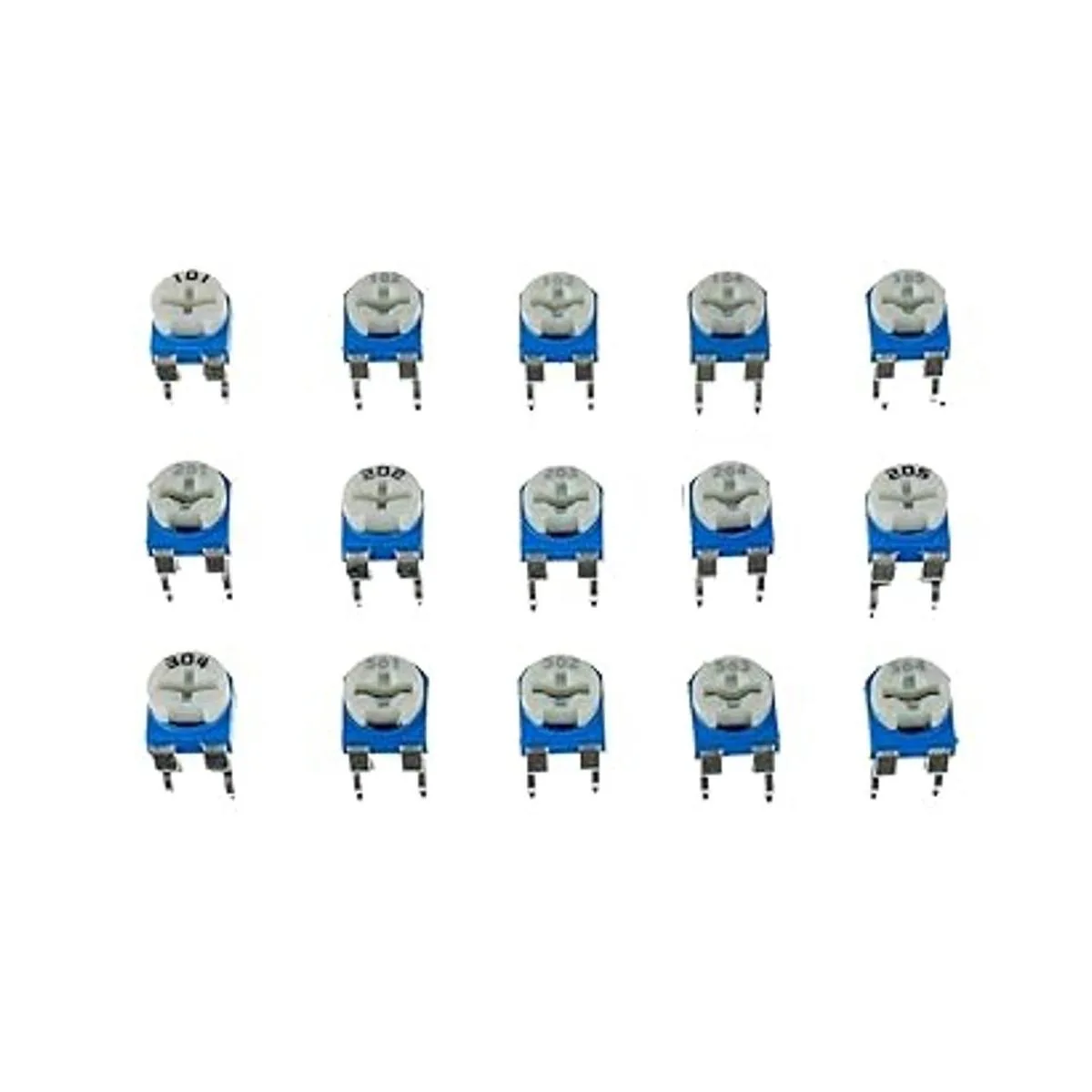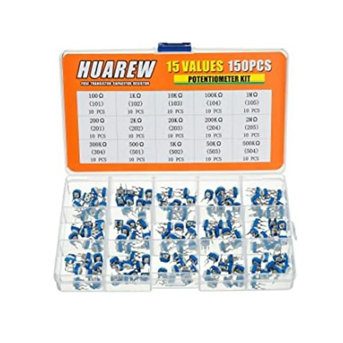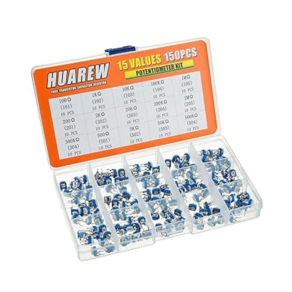 HUAREW 15 valores, 150 unidades, potenciómetro de película de carbono de resistencia ajustable azul y blanco, 100 ohmios 2M ohmios 0.236 in, kit surtido de resistencia de recortadora variable