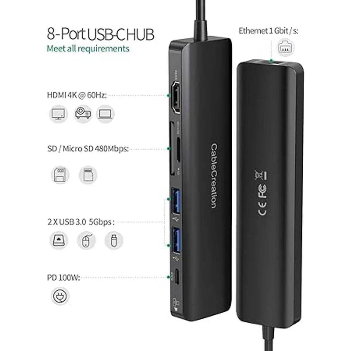 Hub USB C 4K 60Hz, CableCreation 7 en 1 USBC Hub multipuerto con HDMI, 100W PD, Gigabit Ethernet, lector de tarjetas SDTF, 2 puertos USB 3.0, para MacBook Pro Air 20202019, iPad Pro, XPS
