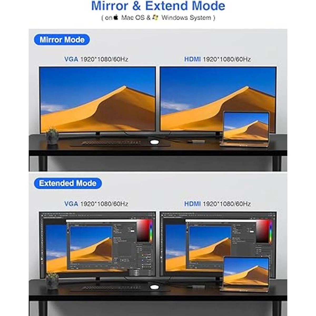 Salida UHD 4K: haz tu vida más colorida: refleja o extiende tu pantalla con el puerto HDMI del adaptador USB C y transmite directamente video 4K UHD o Full HD 1080P a HDTV, monitores o proyectores para una fiesta visual similar al cine. Cuando los puertos de salida HDMI y VGA funcionan simultáneamente, la pantalla puede duplicarse y extenderse, pero la resolución máxima de ambos puertos es de 1080P.