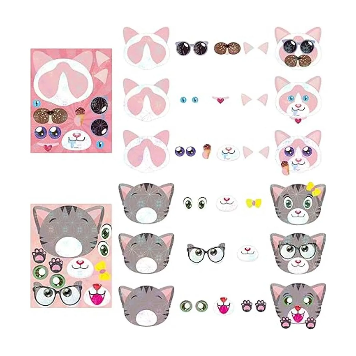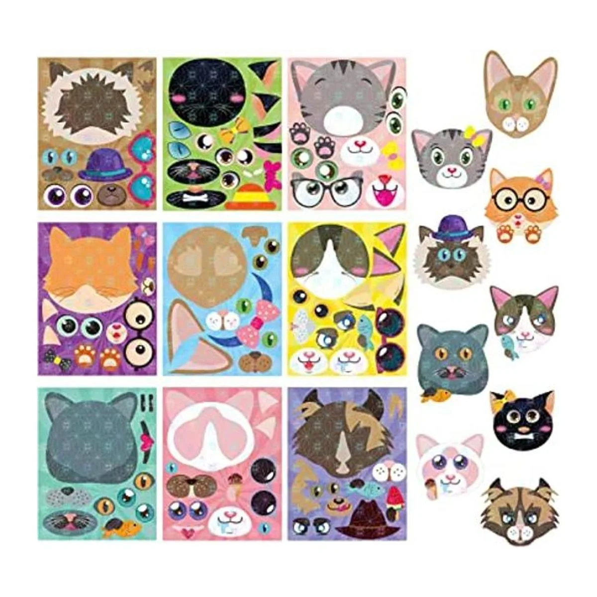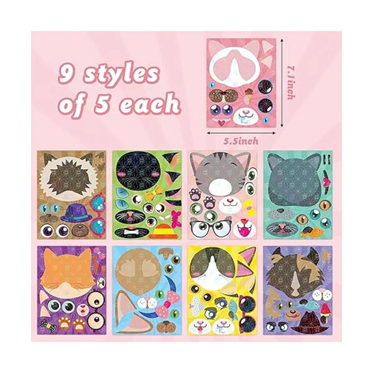 Temática de gatos: recibirás un total de 45 calcomanías en nueve estilos, cinco para cada estilo, el tema de las calcomanías faciales es gatos, y tu hijo puede hacer sus propias calcomanías únicas de cara de gato.