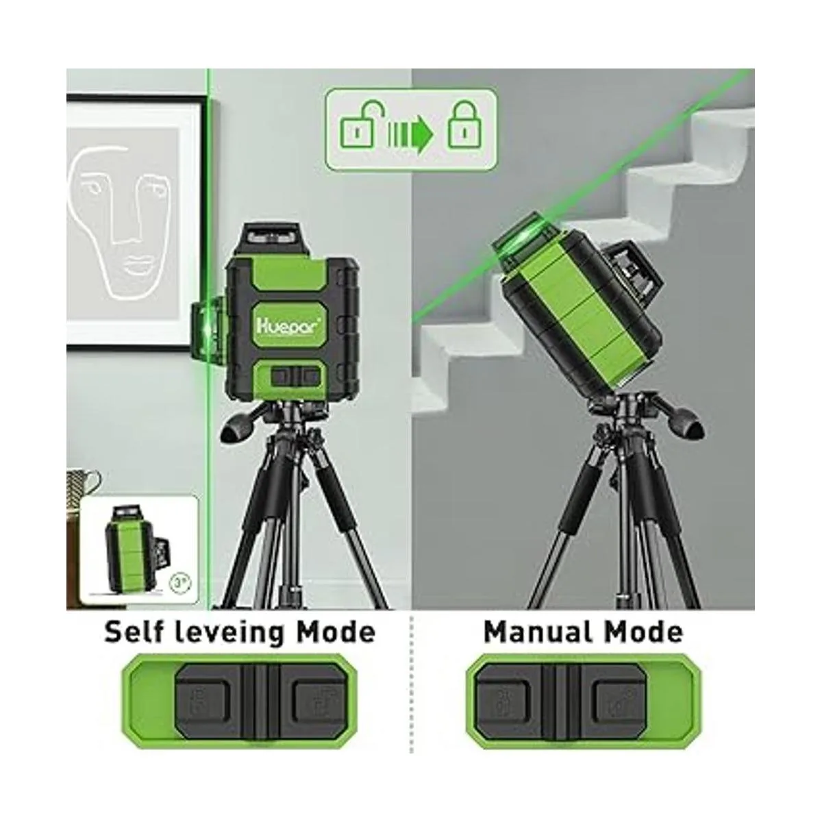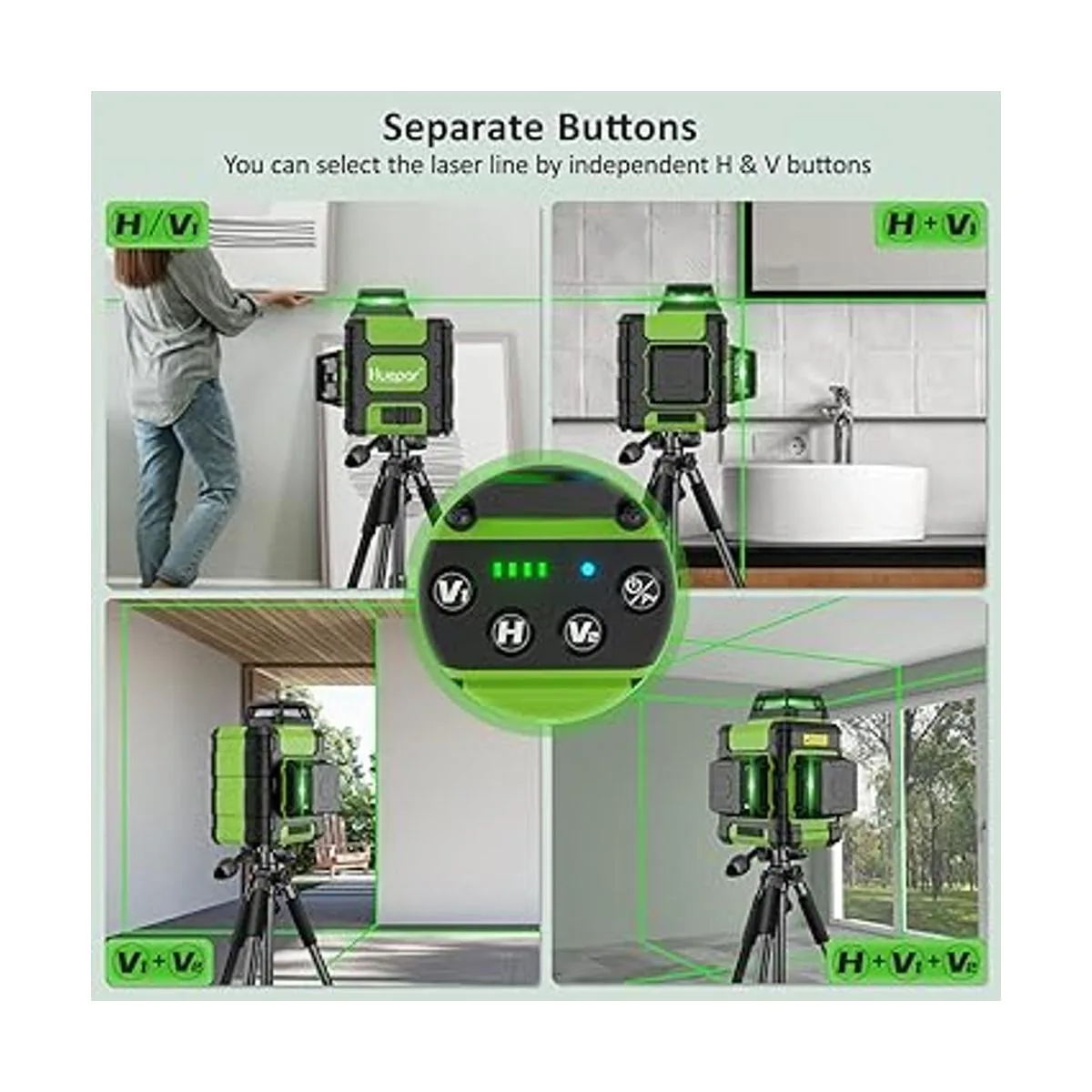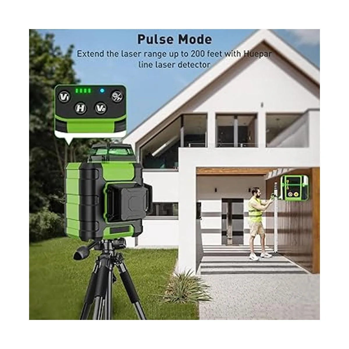 Huepar 360 láser autonivelante para exteriores, línea cruzada 3D de tres aviones, haz verde, herramienta láser de alineación de 12 líneas con modo de pulso, batería de iones de litio recargable impermeable IP54 y estuche de transporte duro