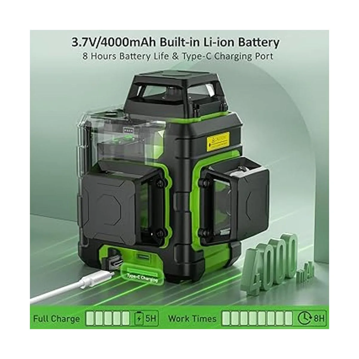Puerto de carga tipo C y batería duradera: el nivel láser Huepar HM03CG funciona con una batería recargable integrada de iones de litio de 4000 mAh y 3.7 V que proporciona 8 horas de tiempo de funcionamiento continuo. 4 indicadores de batería en el teclado permiten a los usuarios saber el volumen actual de la batería y la protección de carga ayudan a prevenir la sobrecarga. Con puerto de carga tipo C, el nivel láser también se puede cargar por teléfono, laptop, banco de energía, cargador de coche, etc.