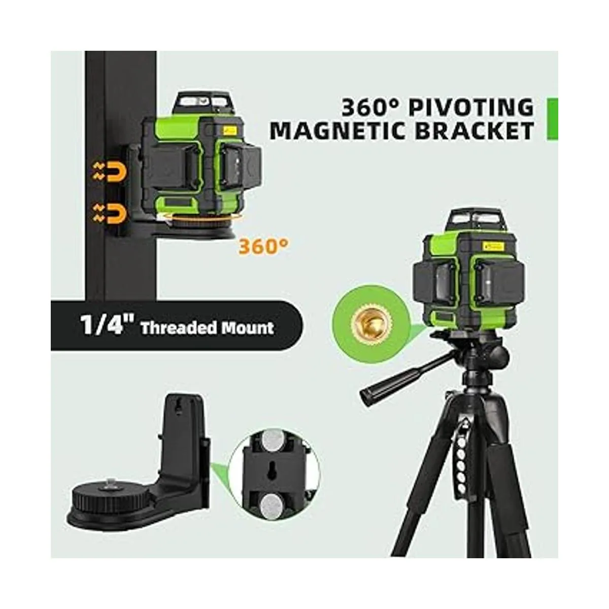 Rosca de montaje y soporte magnético de 360: este láser de línea verde tiene rosca de montaje de 1/420 para fijarse en un trípode. El soporte magnético fuerte de 360 permite un posicionamiento rápido en superficies metálicas para colgar la herramienta láser en el ángulo requerido y ofrece roscas de montaje de 1/420 y 5/811 para adaptarse a diferentes roscas de trípode. Dos agujeros para clavos para más métodos de fijación cuando se trabaja. Dos agujeros para clavos en el soporte para más métodos de fijación y adecuados para colgar cuadros y papel pintado en proyectos en casa.