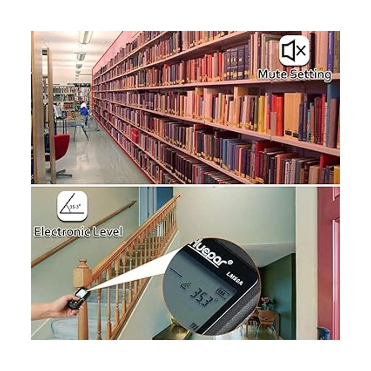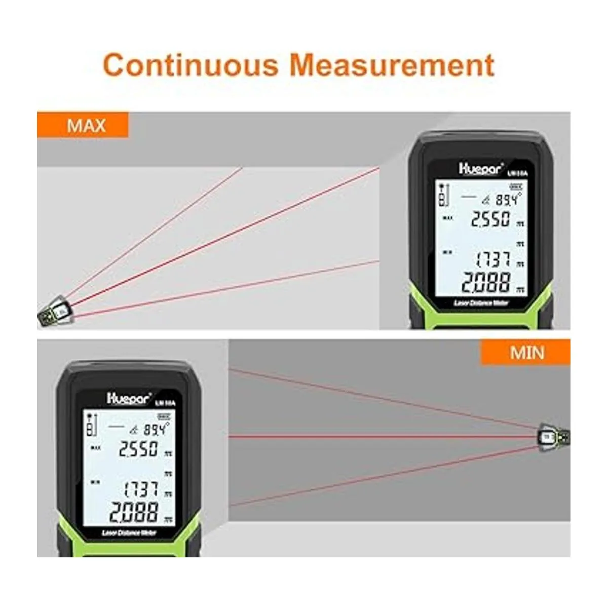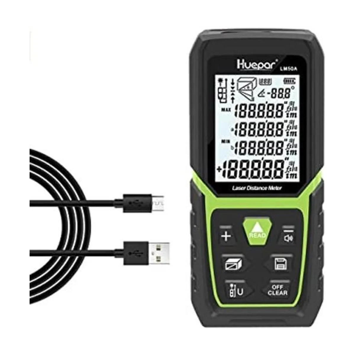 Huepar Medida de distancia láser de 165 pies con batería de iones de litio y sensor de ángulo eléctrico, medida láser LCD retroiluminada piesentradasM con modos de medición múltiple de alta precisión, pitagórico, distancia, área y volumenLM50A
