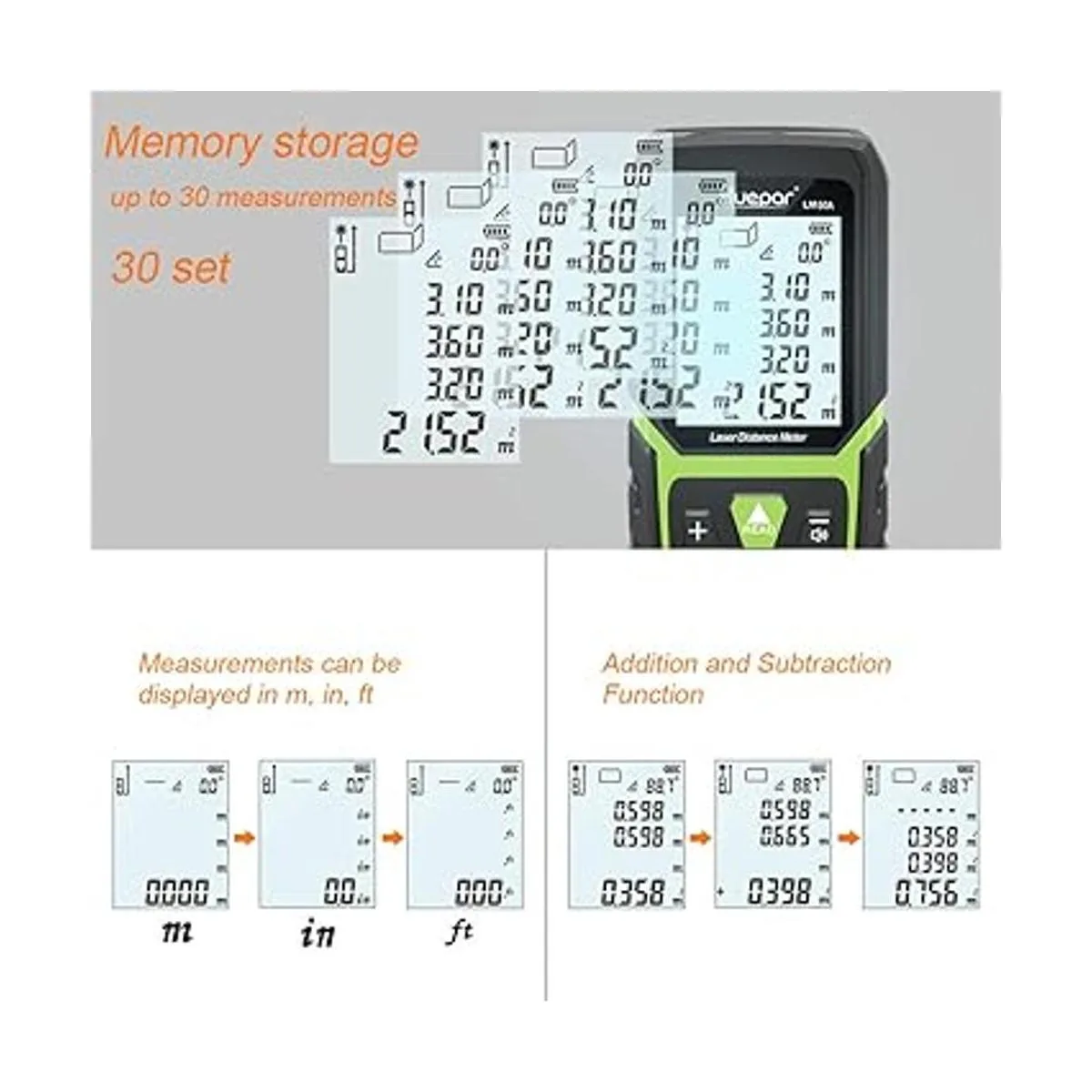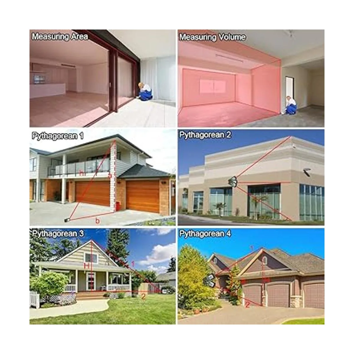 Múltiples modos de medición: esta medida de distancia láser ofrece ángulo, área, distancia, volumen, modos de medición pitágórica. Con medición continua, suma y resta, calibración, cálculo automático de área y volumen y función de memoria de datos de 30 grupos, es ideal para aplicaciones domésticas y de construcción o industrias.