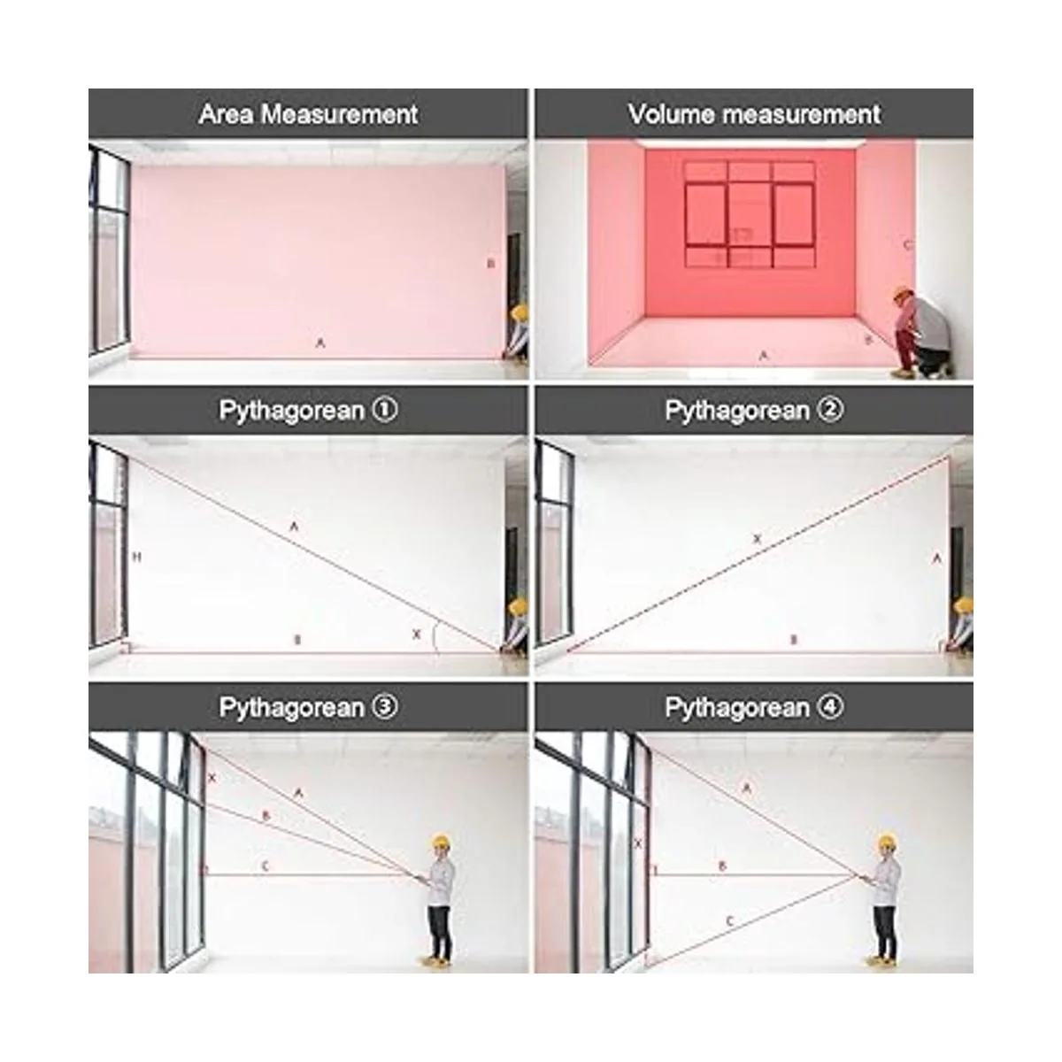 Múltiples modos de medición: esta medida de distancia láser ofrece ángulo, área, distancia, volumen, modos de medición pitágórica. Con medición continua, suma y resta, calibración, cálculo automático de área y volumen y función de memoria de datos de 30 grupos, es ideal para aplicaciones domésticas y de construcción o industrias.