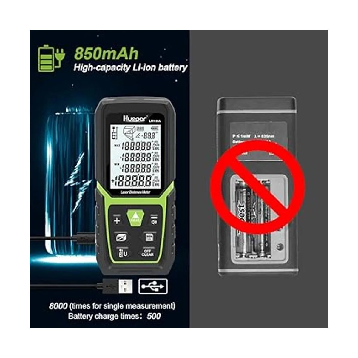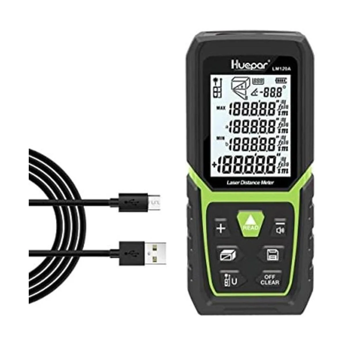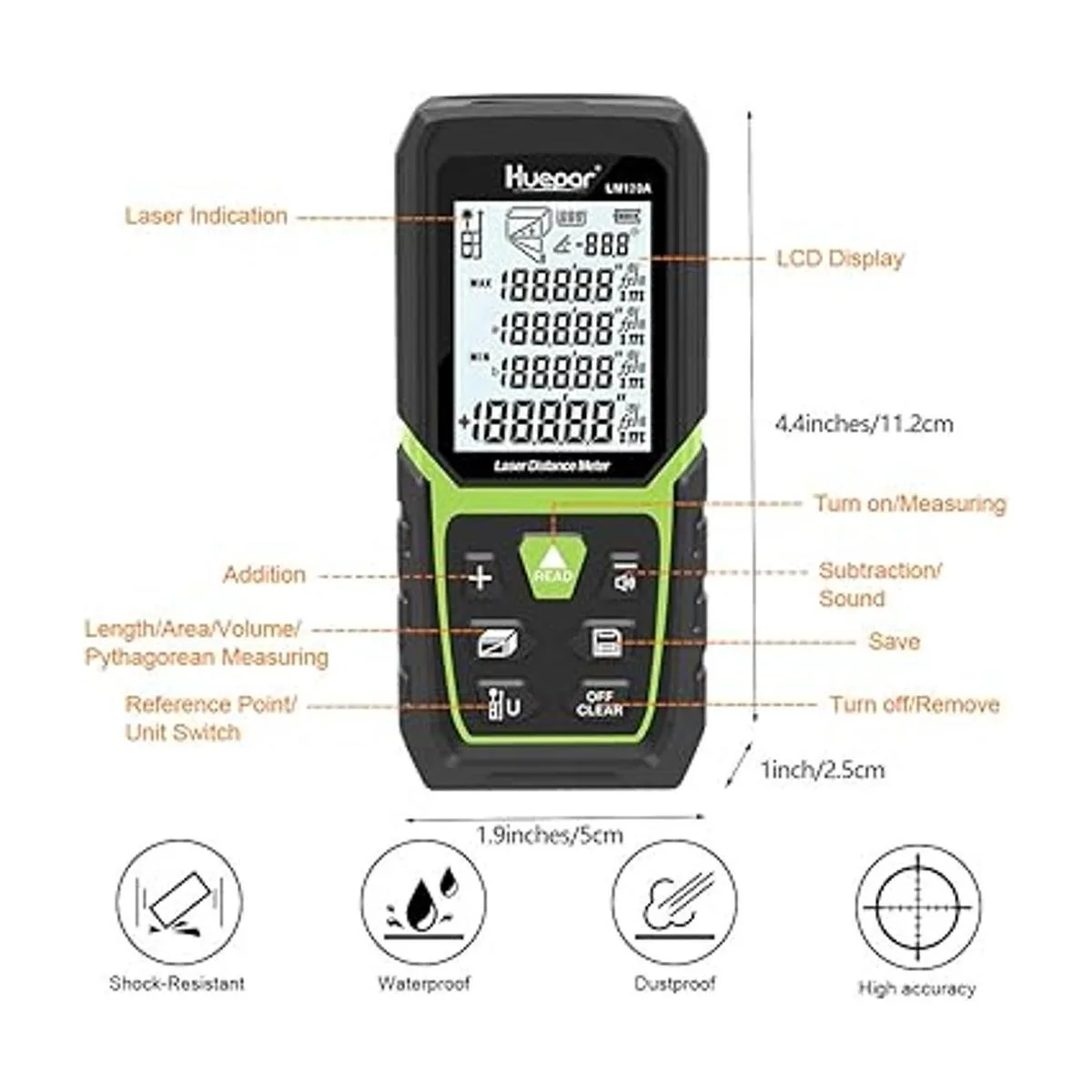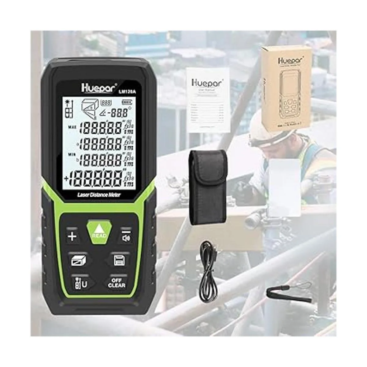 Huepar Medidor de distancia láser de 393 pies con batería de iones de litio y sensor de ángulo eléctrico, medida láser LCD retroiluminada MInFT con modos de medición multimedición de alta precisión, Pitágoras, distancia, área y volumenLM120A