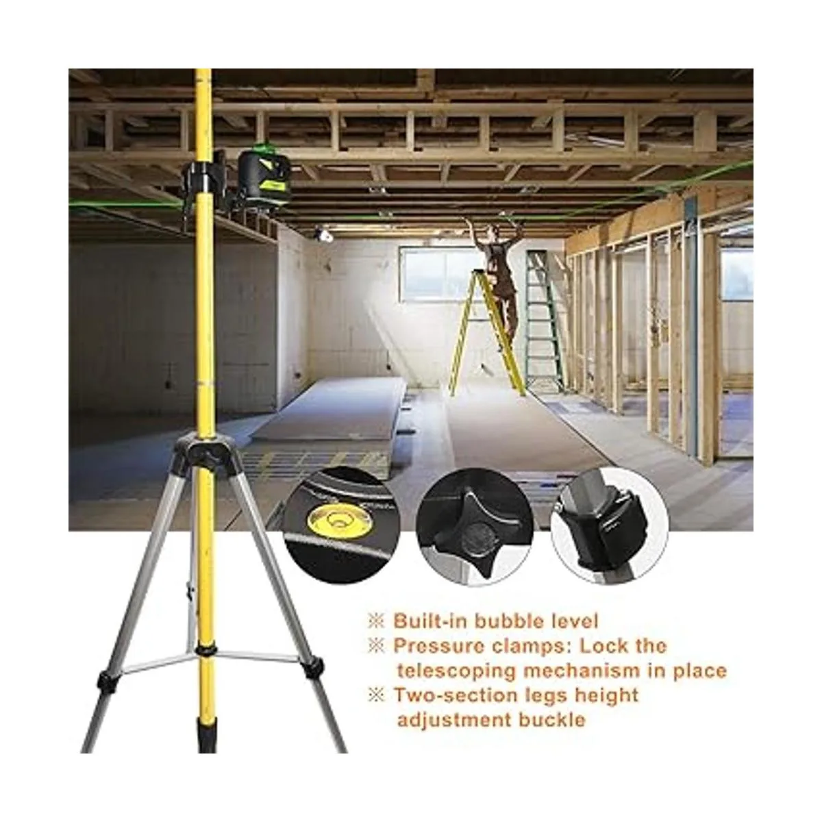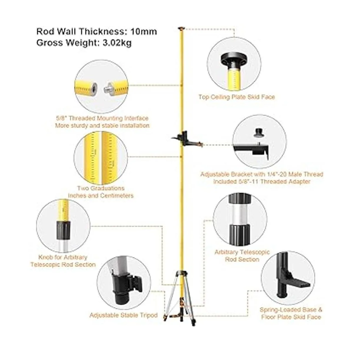 Base de trípode estable con burbujas integradas: hebilla de ajuste de altura de dos secciones para satisfacer tus diferentes necesidades, rango de altura ajustable de 0,48 a 2.8 ft. Mientras que una abrazadera de tornillo en el lado de la cabeza estabiliza el poste para que no se mueva. Además, hay un pequeño nivel de burbuja incrustado en la cabeza para garantizar que tus medidas sean lo más precisas posible.