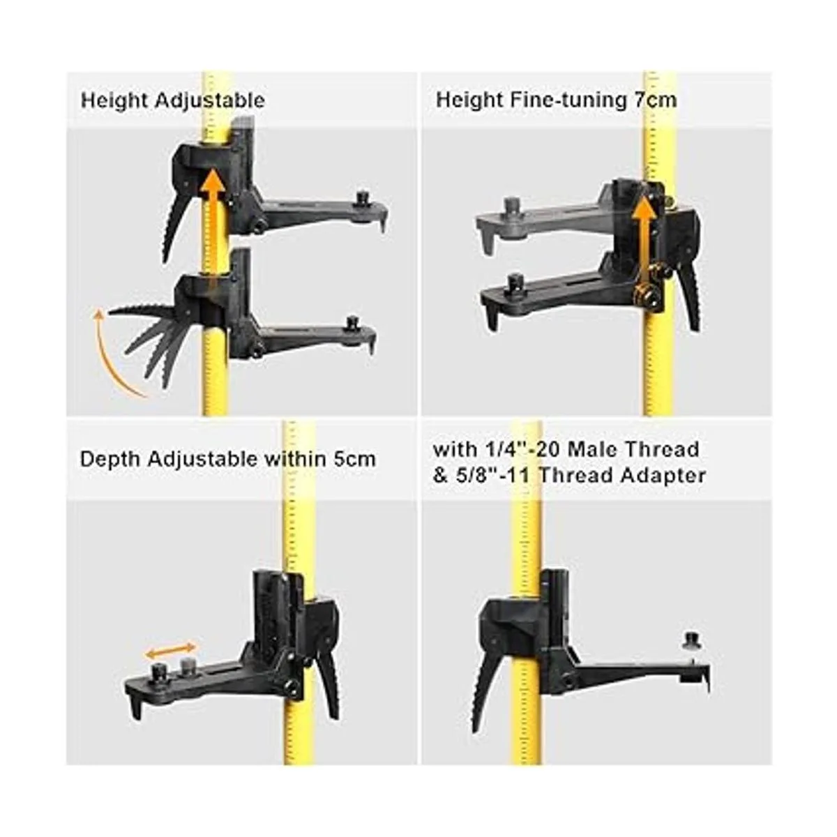 Soporte de ajuste fino multifunción: soporte de montaje con rosca macho de 1/420 y adaptador de rosca de 5/811, compatible con la mayoría de láseres de línea y láseres giratorios. El soporte se puede colocar a cualquier altura de la barra de acuerdo a tus necesidades. Con una perilla de ajuste de altura, el rango de ajuste fino es de 2.8 in. Se puede ajustar dentro de 2.0 in de profundidad para que se pueda utilizar con cualquier instrumento que mida 6.511.5 desde la parte posterior.