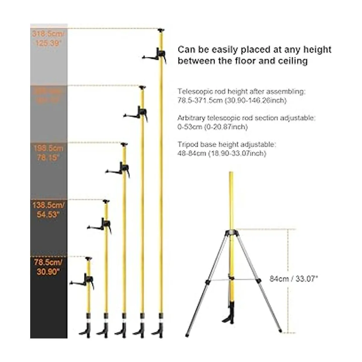 Varilla telescópica ajustable arbitrariamente: barra de montaje Huepar LP36, una barra telescópica ideal para cualquier lugar de trabajo utilizando herramientas que se pueden colocar fácilmente a cualquier altura entre el suelo y el techo. Incluye cuatro varillas telescópicas y una barra de cola, sección de barra de cola con sección de barra telescópica arbitraria puede telescopiar otros 20.9 in. Tiene 12.1 ft cuando está totalmente montado con todas las secciones y ambas partes extremas. Las graduaciones están marcadas en negro en el poste amarillo en pulgadas y centímetros.
