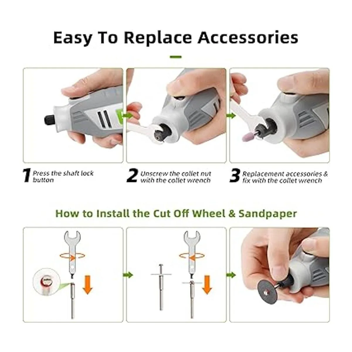 Práctico juego de herramientas múltiples: viene con 222 accesorios y 5 accesorios son suficientes para satisfacer diferentes necesidades, puede rescatarte de buscar el nuevo juego y ahorrar dinero. Hay un bucle en el extremo de la herramienta, que se puede colgar en el gancho y utilizar con un eje flexible que puede ampliar mejor el espacio de trabajo, incluso desde ángulos incómodos; el protector de cubierta puede proporcionar una protección perfecta de 360; el mango auxiliar puede proporcionar estabilidad para trabajos finos.