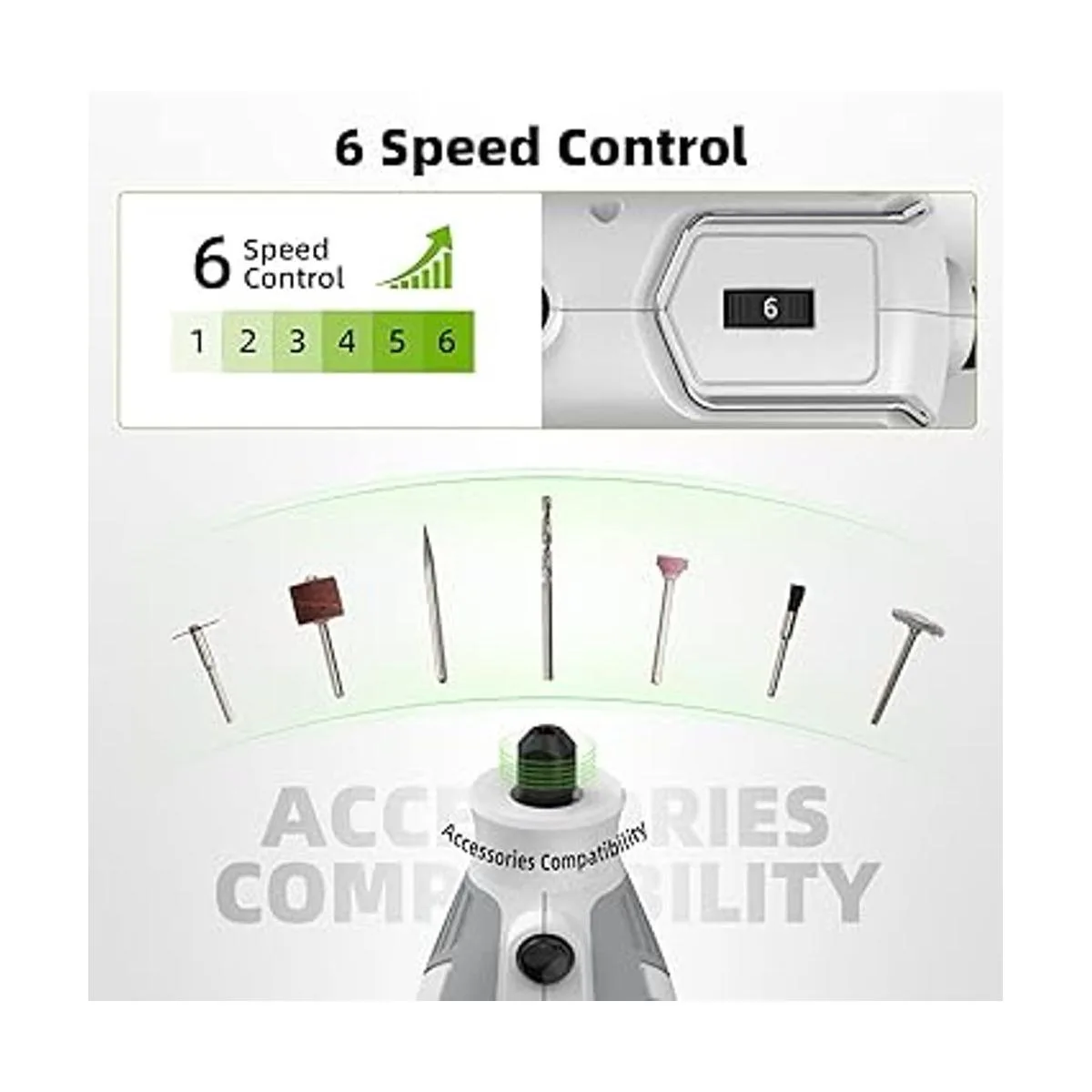 Motor de 200 W y velocidad variable de 6 niveles: el motor de alta potencia de 200 W puede proporcionar una potencia potente, soporta velocidades variables de 6 niveles de 10.000 a 40.000 rpm. Baja velocidad para aplicaciones de limpieza y uso de accesorios de cepillo, alta velocidad para enrutamiento, corte, lijado. Al ajustar la velocidad, puedes hacer grabados delicados en madera, vidrio, metales, plásticos, azulejos y otros materiales con control fácilmente, satisface tus diversas necesidades de bricolaje.