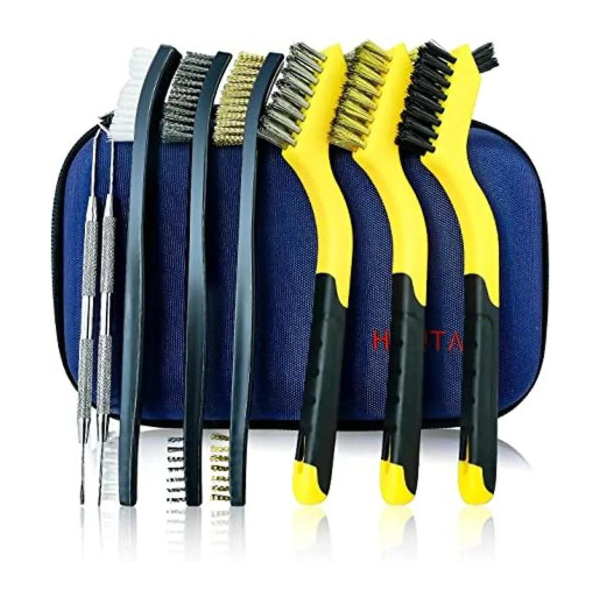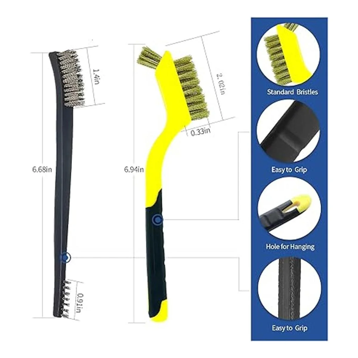 Cepillo de metal para la limpieza: tres cepillos de alambre diferentes para que elijas. Un cepillo de alambre de acero inoxidable se puede utilizar para piezas de óxido. Los cepillos de nailon se pueden utilizar para limpiar y refinar piezas frágiles. Los cepillos de latón se pueden utilizar para limpiar piezas de metal sin terminar sin dañar la superficie de la púa de limpieza de acero inoxidable ayuda a limpiar el lugar pequeño obstinado