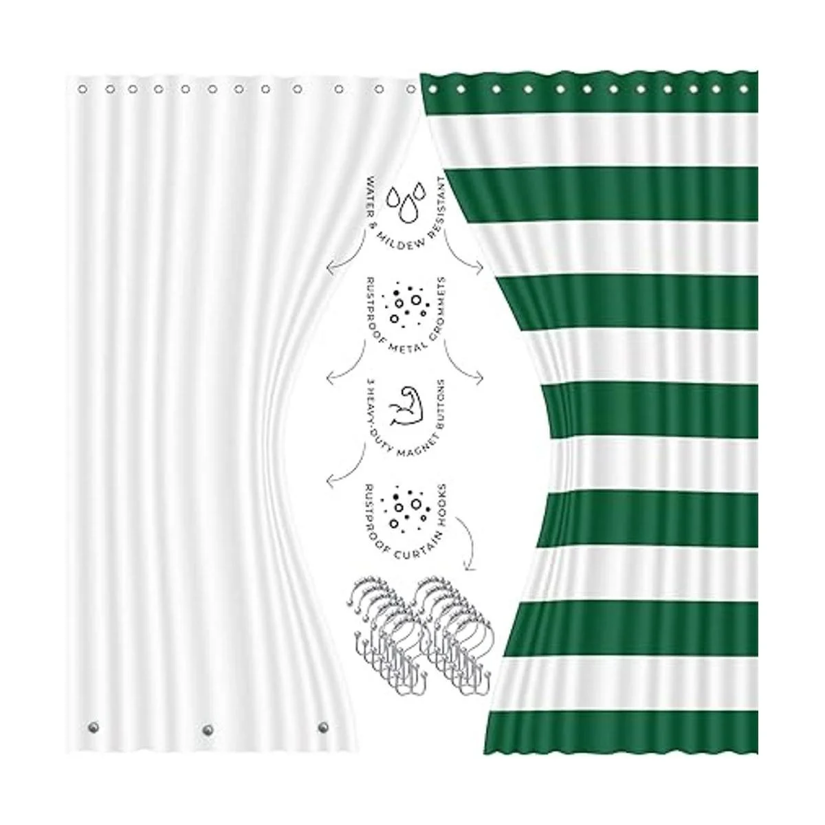 Juego de cortina de ducha y forro: nuestra cortina de ducha de tela con patrón clásico y color encantador, hará que tu baño sea fabuloso. Es duradero, resistente a las arrugas, 100 poliéster y cuenta con cabecera reforzada y agujeros de gancho. Mide 72 x 72 pulgadas para una cobertura completa de la cabina de ducha. Incluye forro de cortina de ducha de PEVA con imanes pesados en la parte inferior del forro para pegar a tu bañera.