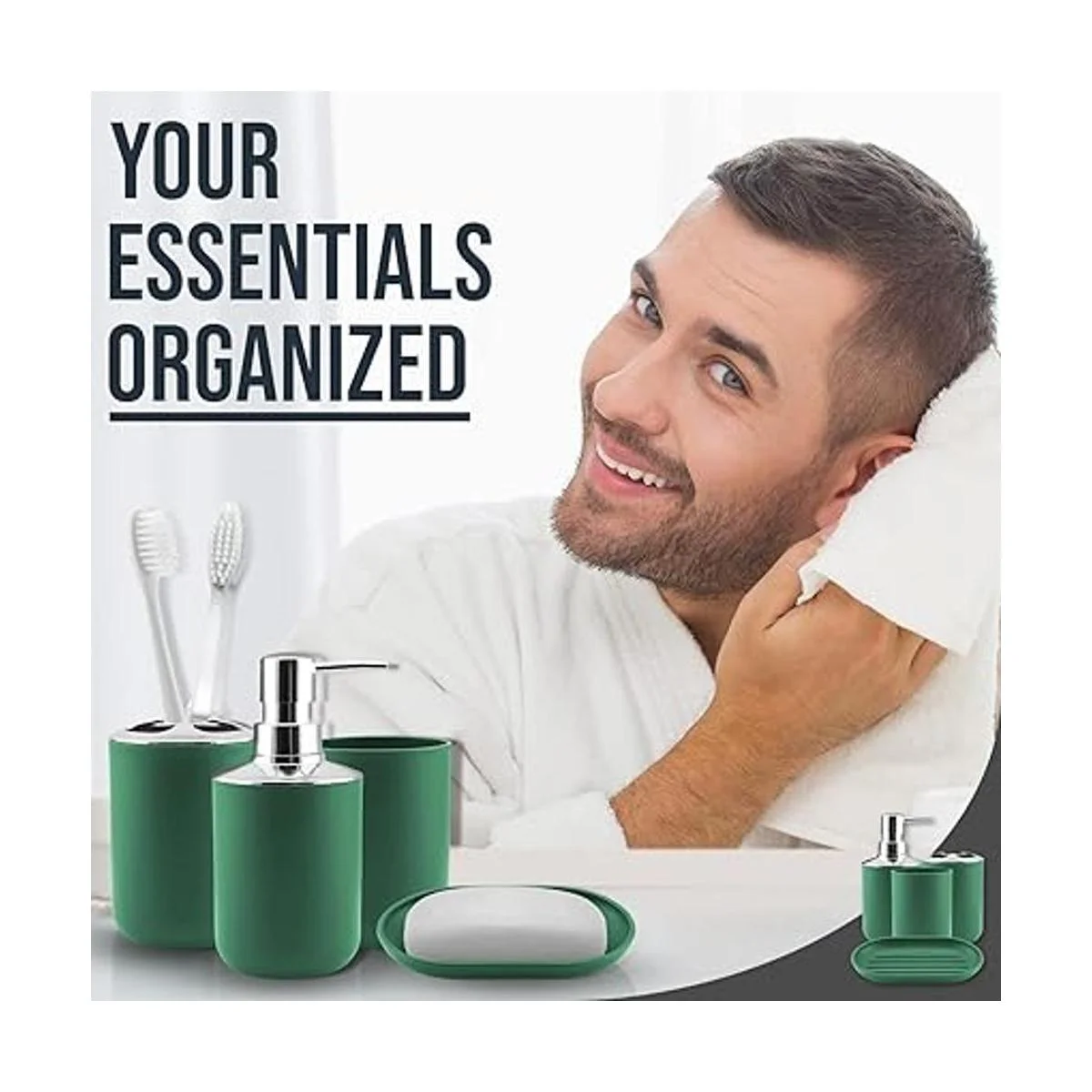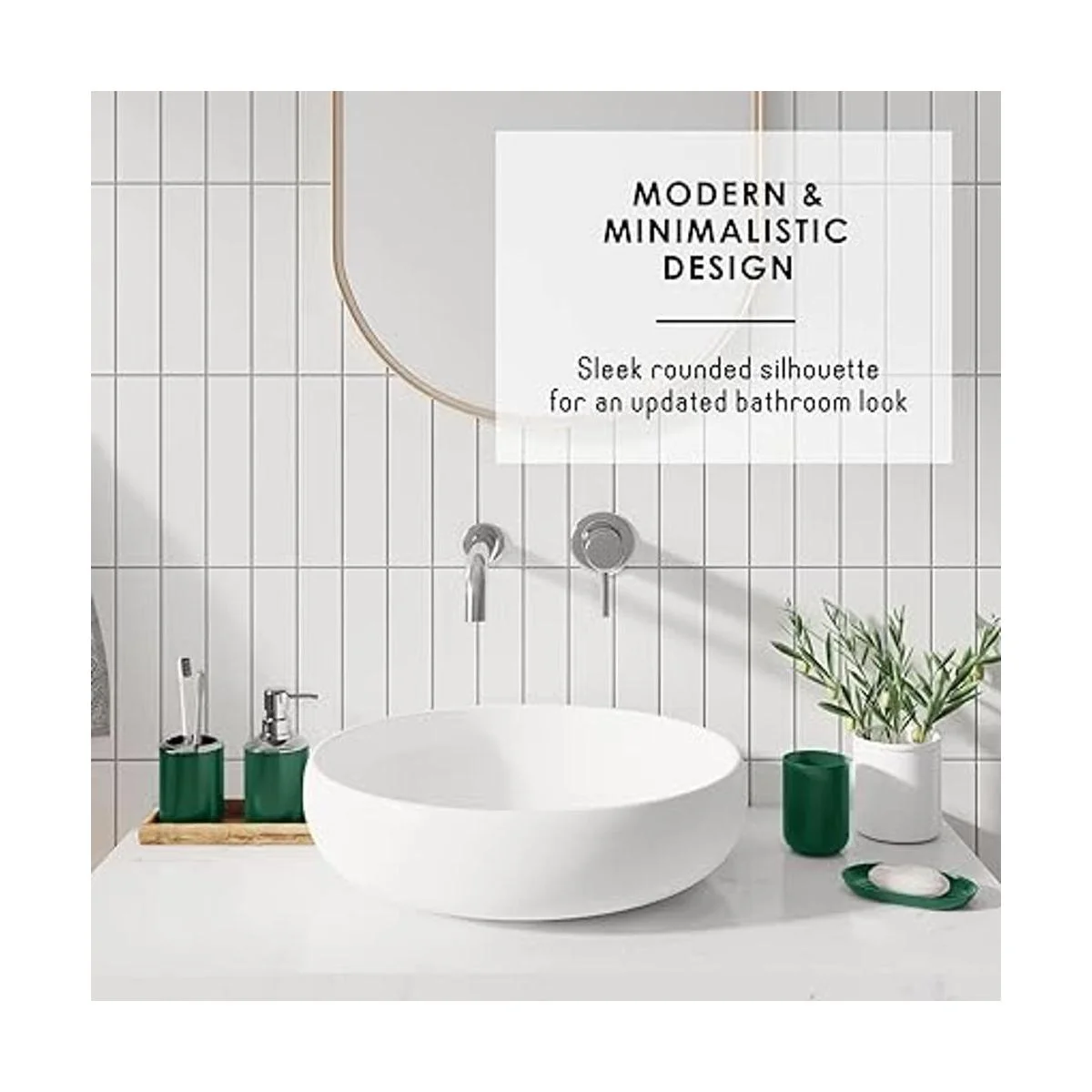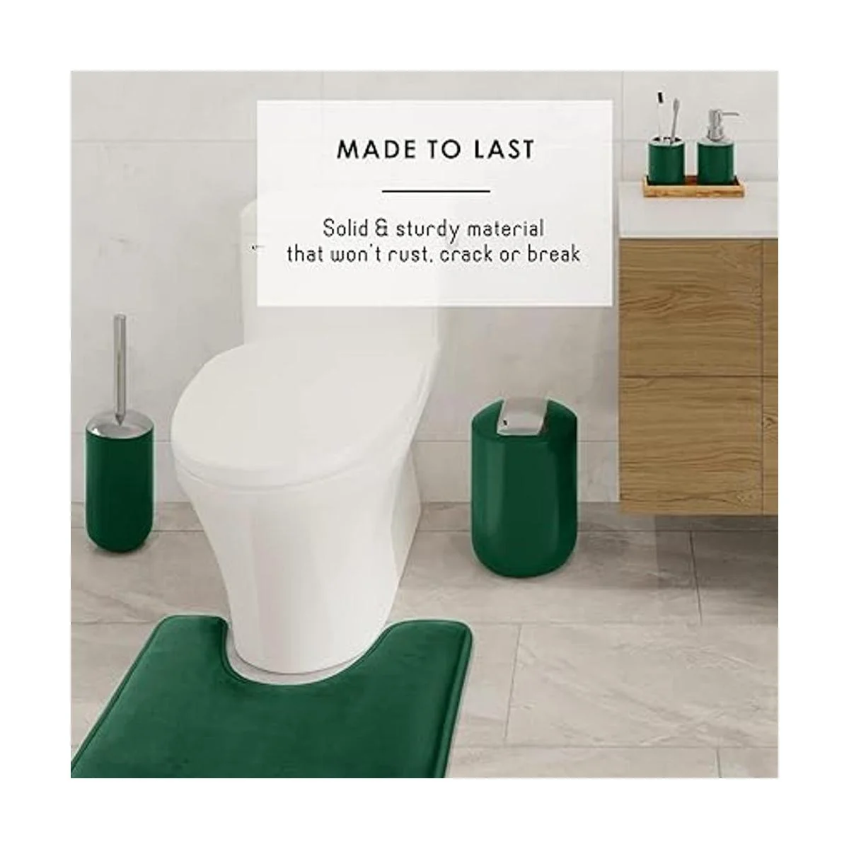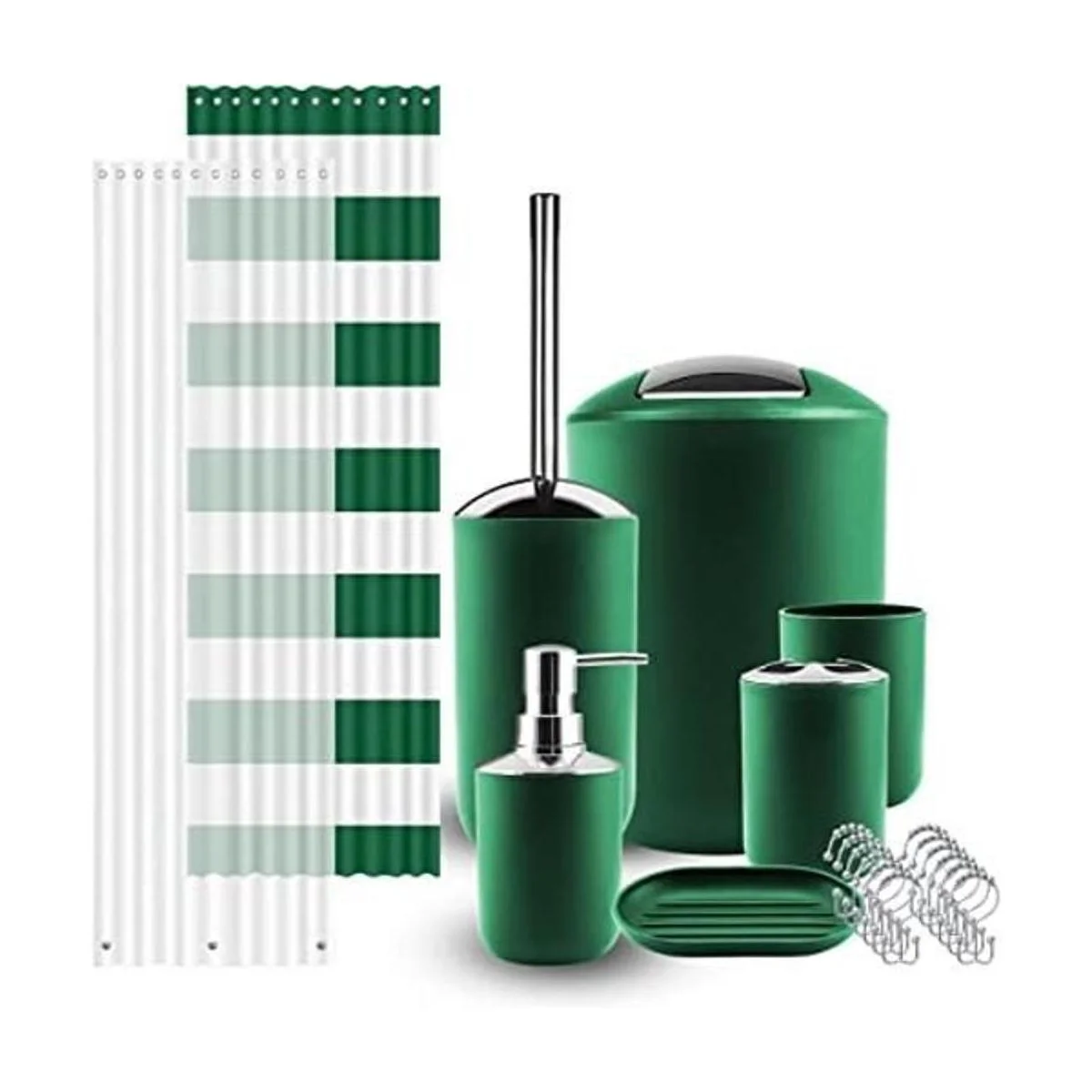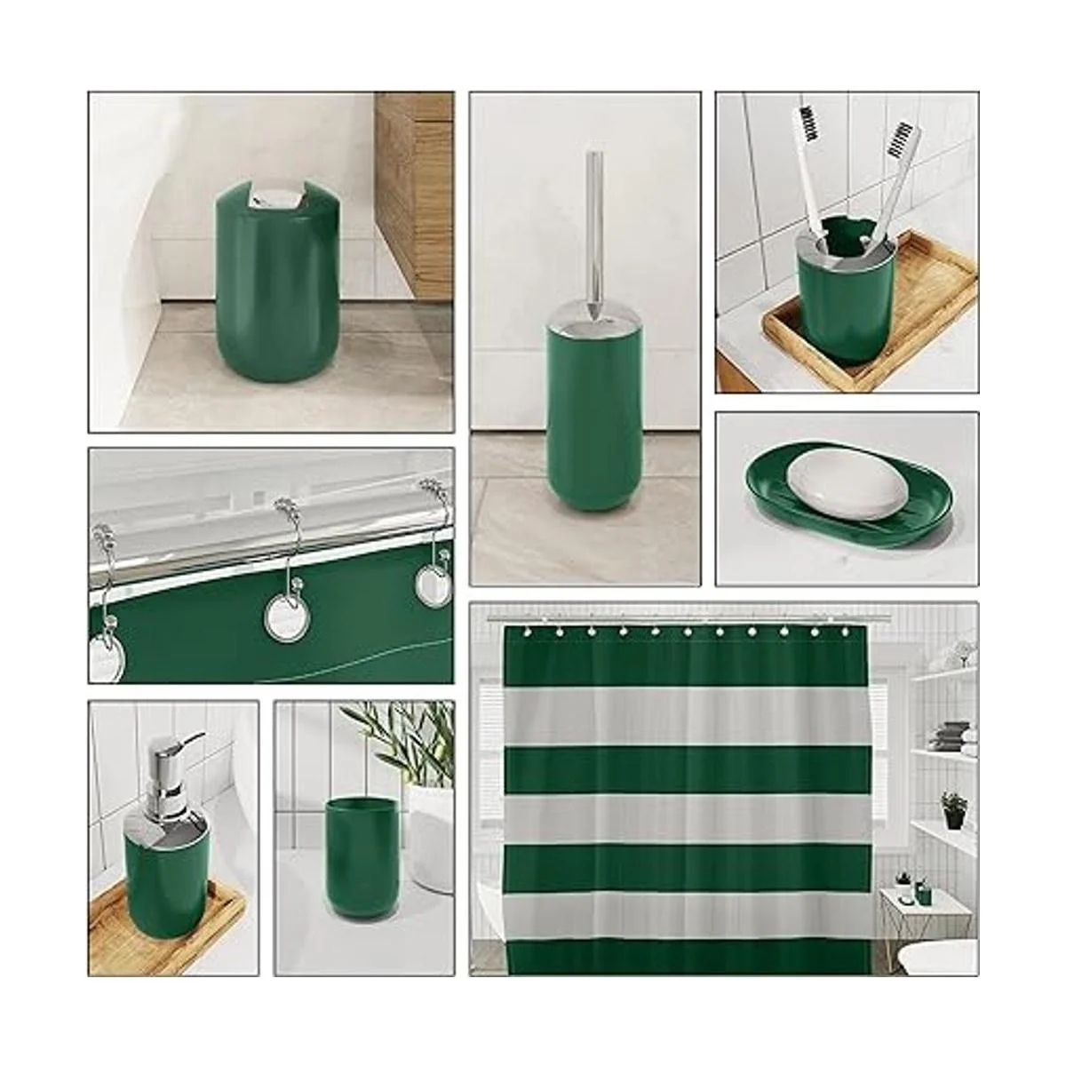 Hunter Green Juego de accesorios de baño de 9 piezas con forro de cortina de ducha y 12 ganchos, dispensador de jabón y plato, soporte para cepillos de dientes con taza, cepillo para inodoro y soporte, cubo de basura