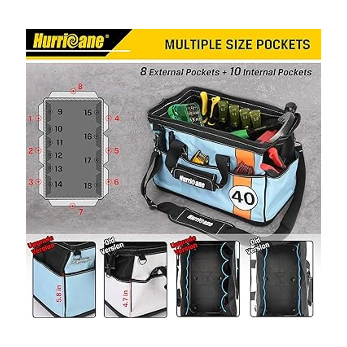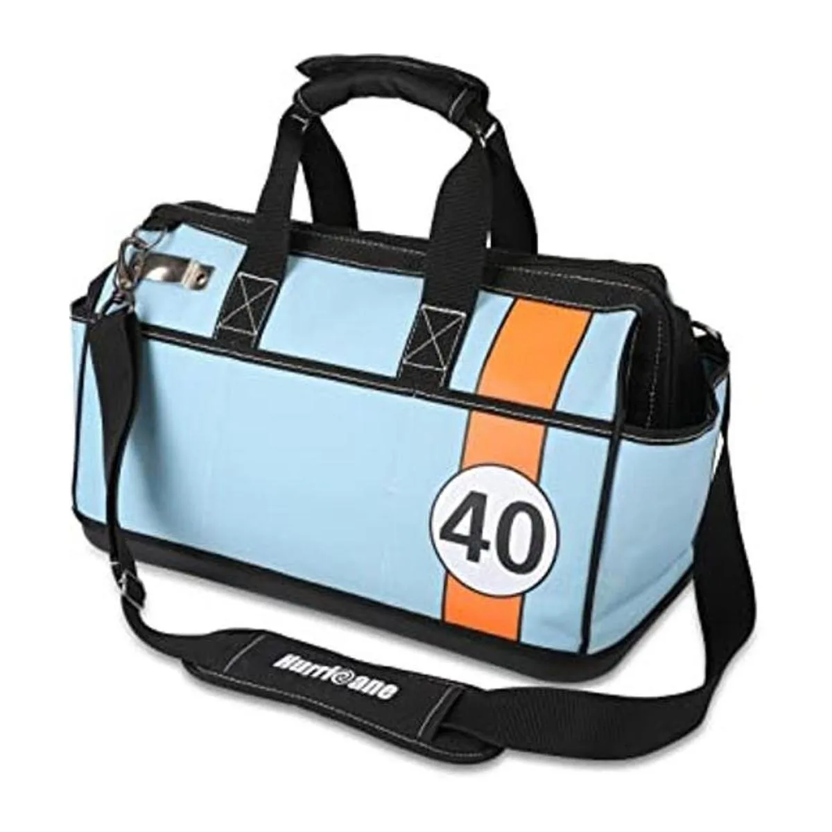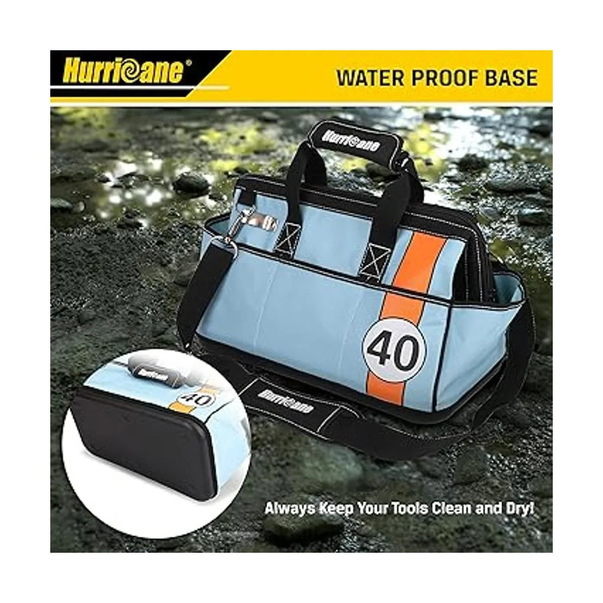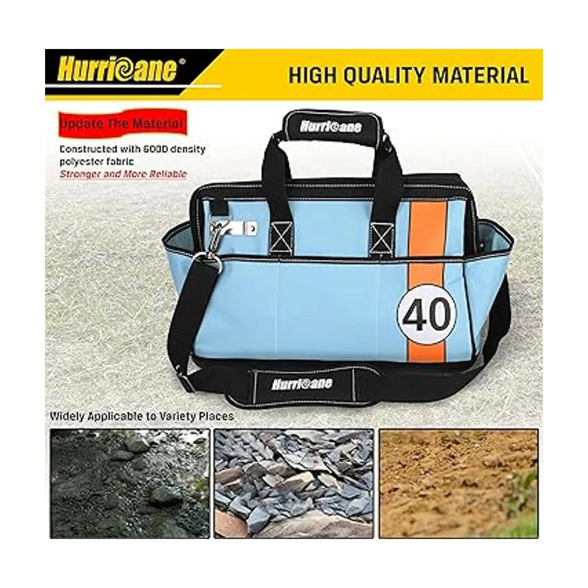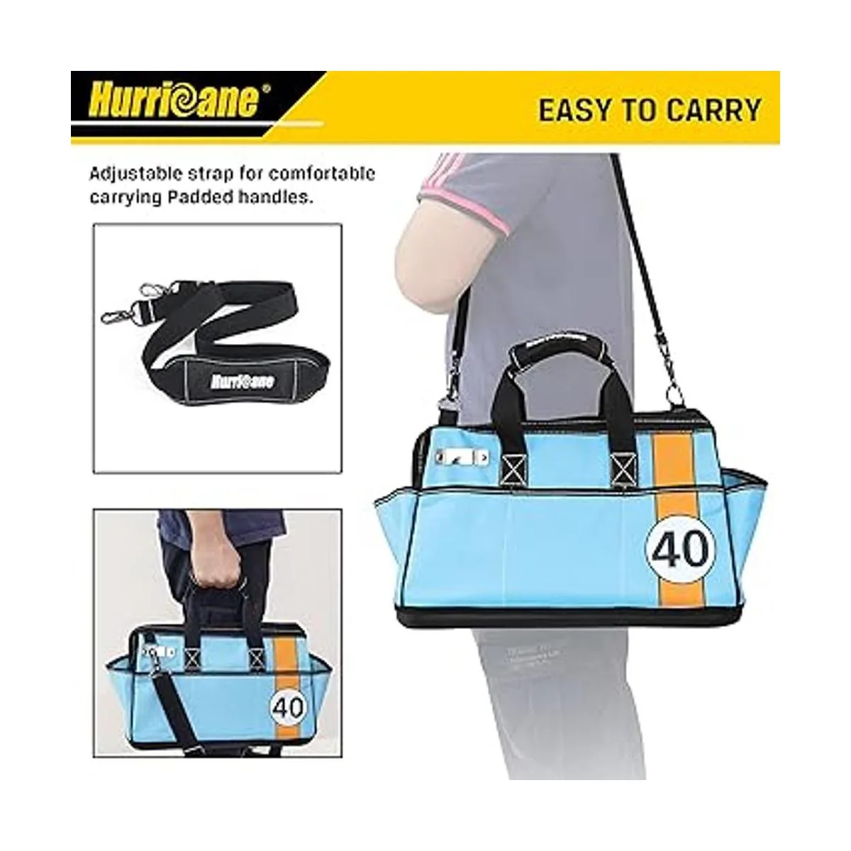HURRICANE Bolsa de herramientas de boca ancha de 16 pulgadas con base moldeada a prueba de agua con correa de hombro adicional, tema de carreras, azul, múltiples bolsillos, gran espacio interior