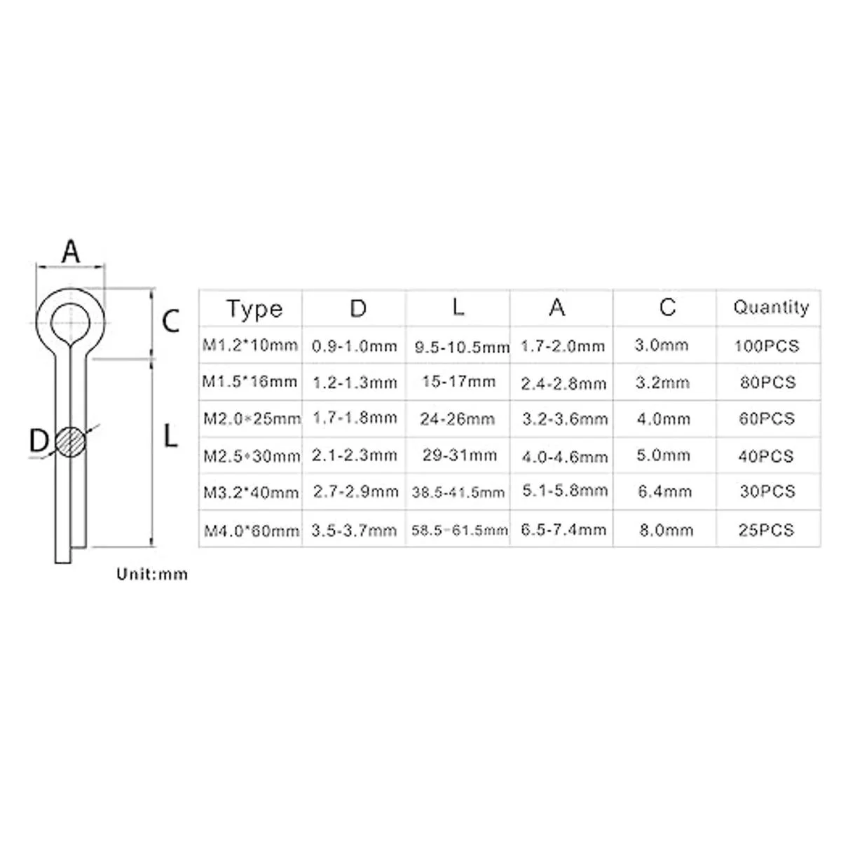 The Assortment contain the following sizes:M1.210mm100PCS;M1.516mm80PCS;M2.025mm60PCS;M2.530mm40PCS;M3.240mm30PCS;M4.06025PCS