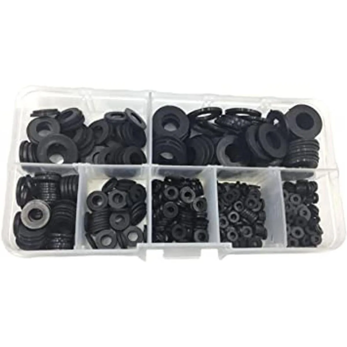 Arandelas planas métricas de nailon, 7 tamaños, color negro, total 500 piezas.