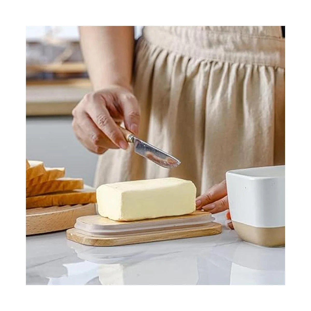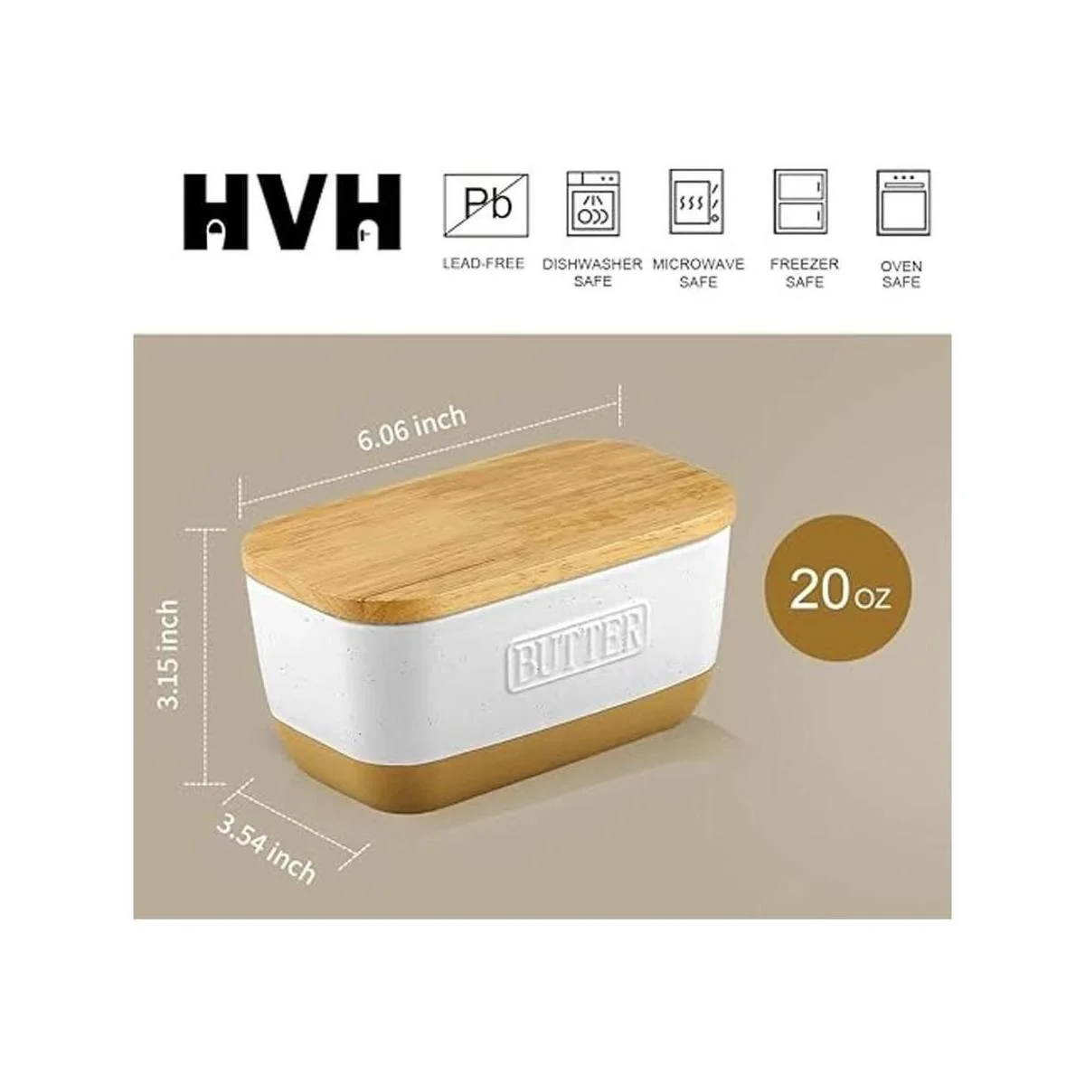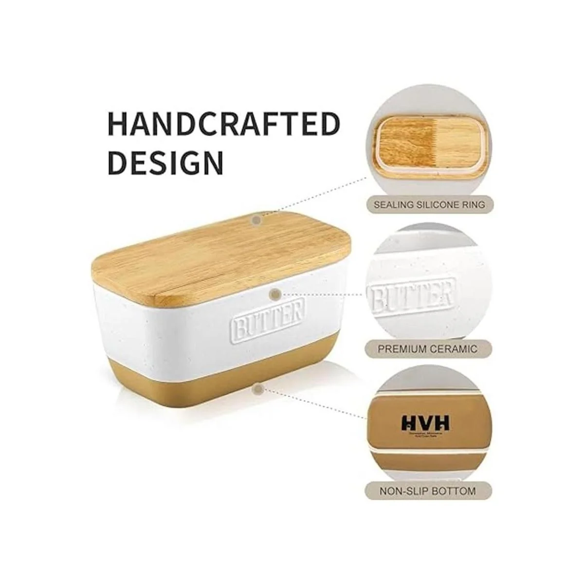 HVH Mantequilla de cerámica con tapa para encimera, soporte hermético con tapa de madera, platos de mantequilla con fundas, recipiente de mantequilla de cerámica, para mantequilla de la costa este oeste, estilo rústico blanco