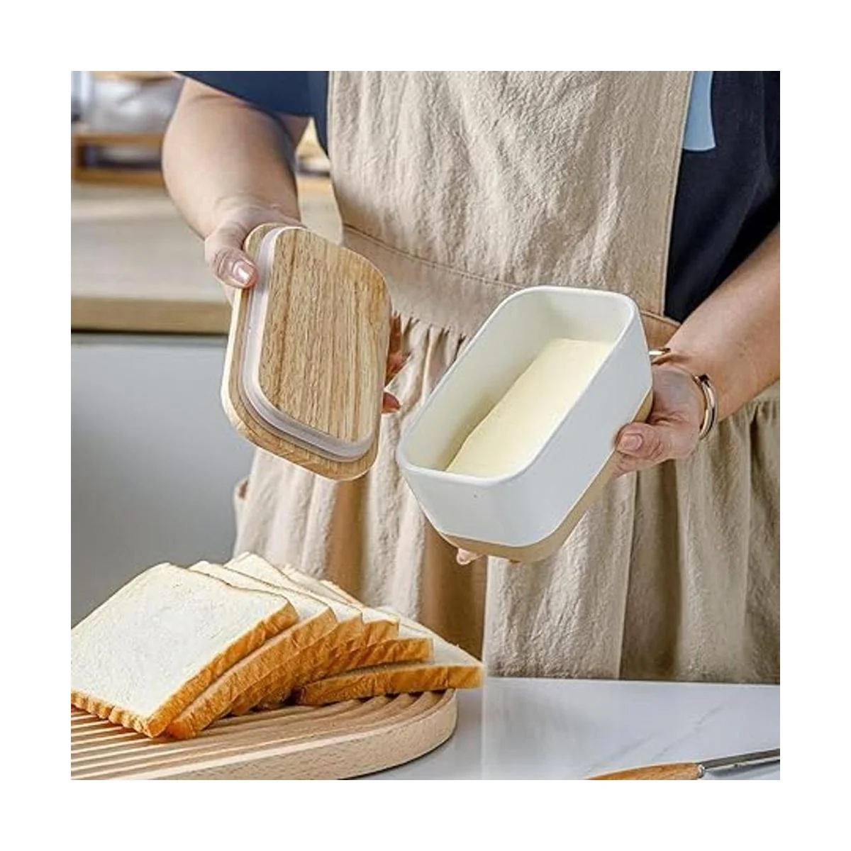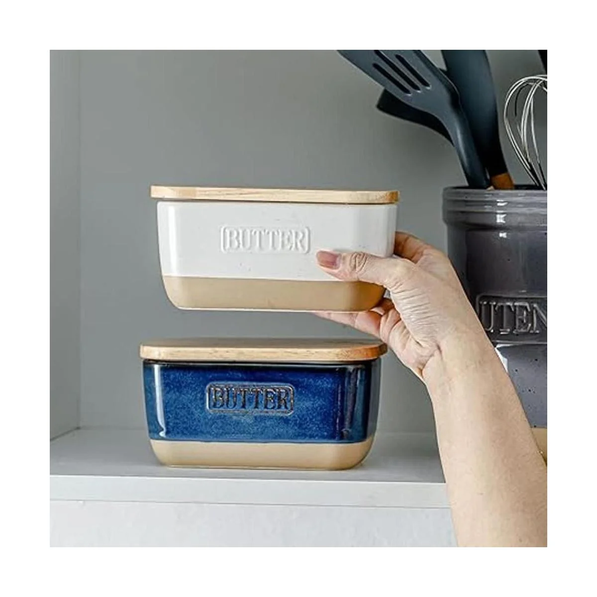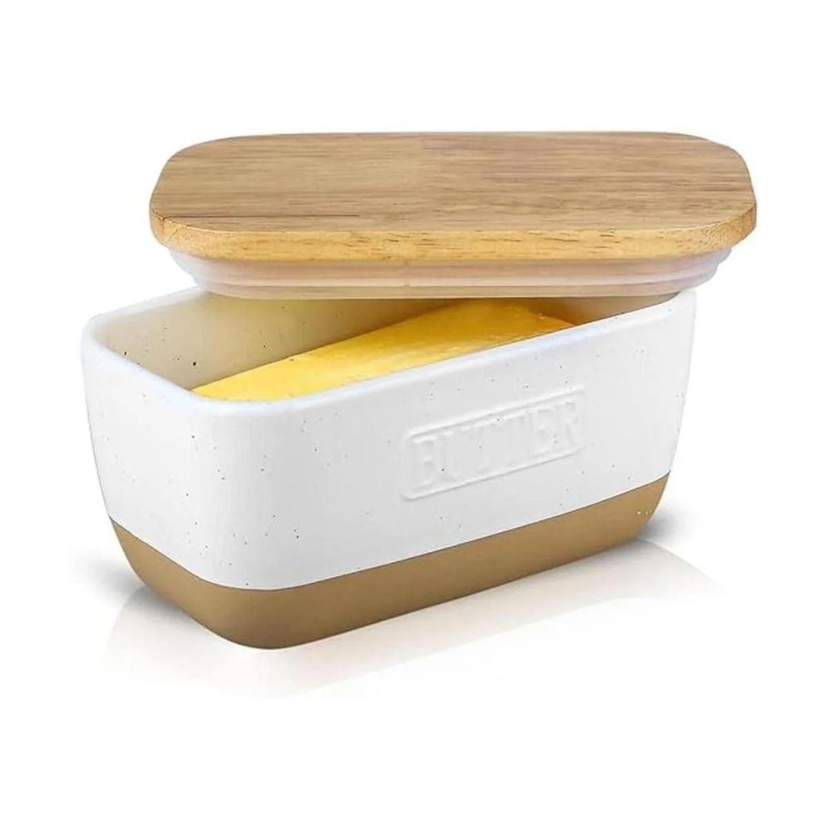 HVH Mantequilla de cerámica con tapa para encimera, soporte hermético con tapa de madera, platos de mantequilla con fundas, recipiente de mantequilla de cerámica, para mantequilla de la costa este oeste, estilo rústico blanco