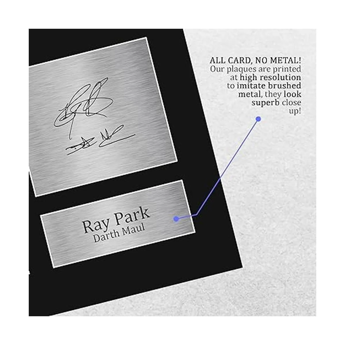 Gran tamaño, calidad y acabado profesionalmente fabricado en nuestro estudio, estas pantallas vienen con una imagen de alta calidad junto con una copia impresa del famoso autógrafo. Montado en un negro mate utilizando un tablero de visualización sin ácidos, perfectamente acabado con una placa plateada con el nombre impreso.