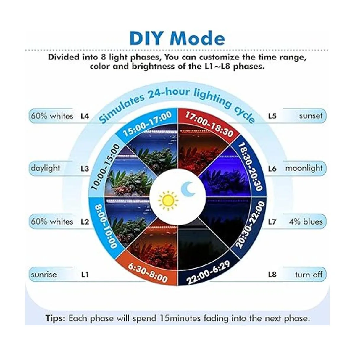 Ofrece opciones personalizables Modo de bricolaje: 24 horas dividido en 8 fases, puedes personalizar la hora, el color y el brillo en cada fase. Modo de luz diurna y luna: espectro completo durante el día luz azul por la noche, también puedes crear tus propias curvas de color. Modo predeterminado: simula un espectro natural de 24 horas, proporcionando un amanecer gradual, luz diurna brillante, luz diurna suave. set y 4 horas Luz de luna y luego se apaga por la noche. Modo climático: puedes elegir el amanecer, puesta de sol, nublado y efecto rayo para añadir diversión a tu tanque