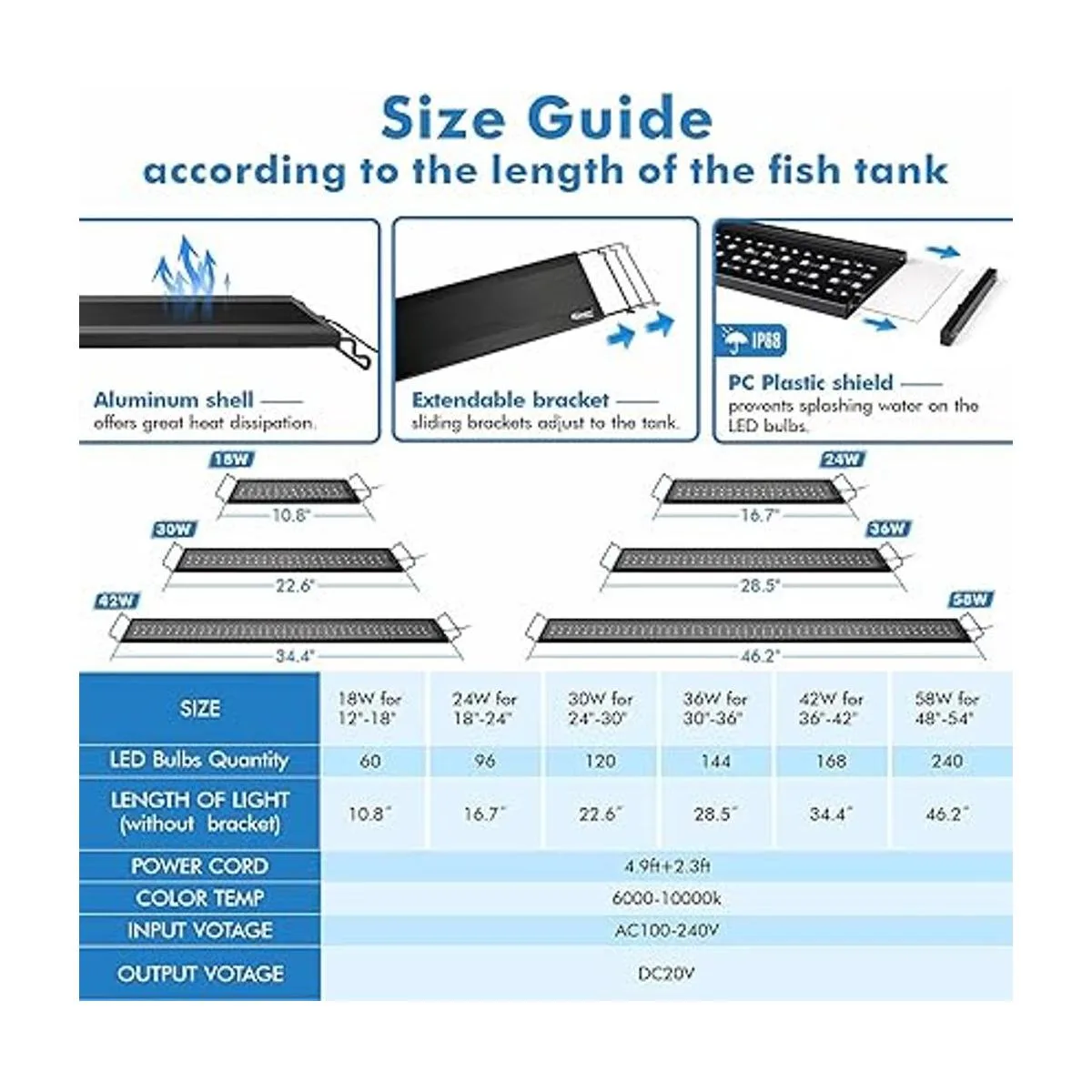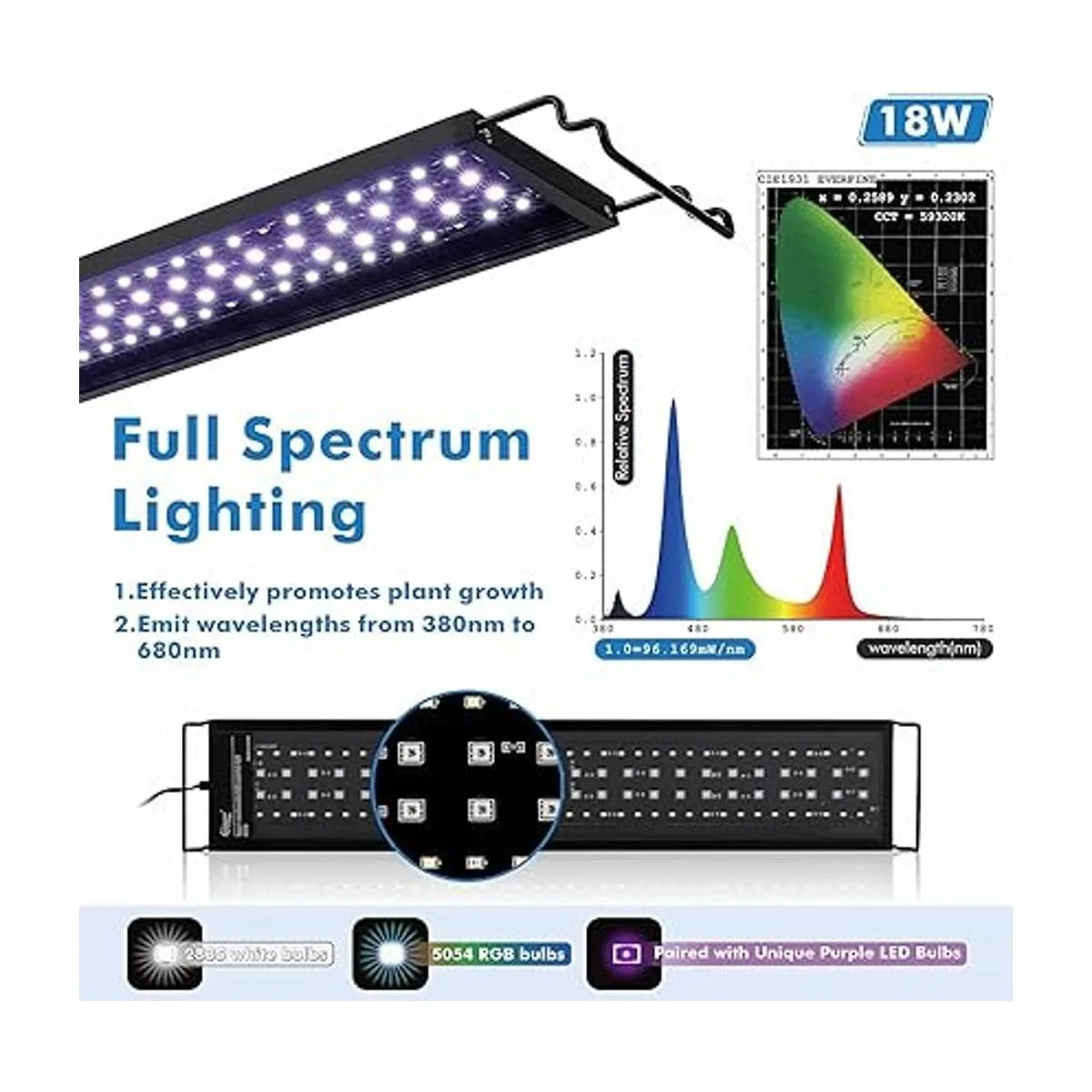 Junto con bombillas LED moradas únicas Estas lámparas de 18 vatios incorporan 60 bombillas LED de cuatro filas de crecimiento eficaz, que consisten en 4 LED morados 24 LED RGB 32 LED blancos integrados para un efecto de iluminación súper brillante y, mientras que proporcionan un ángulo de haz amplio de 120 grados para iluminar las esquinas oscuras del tanque.