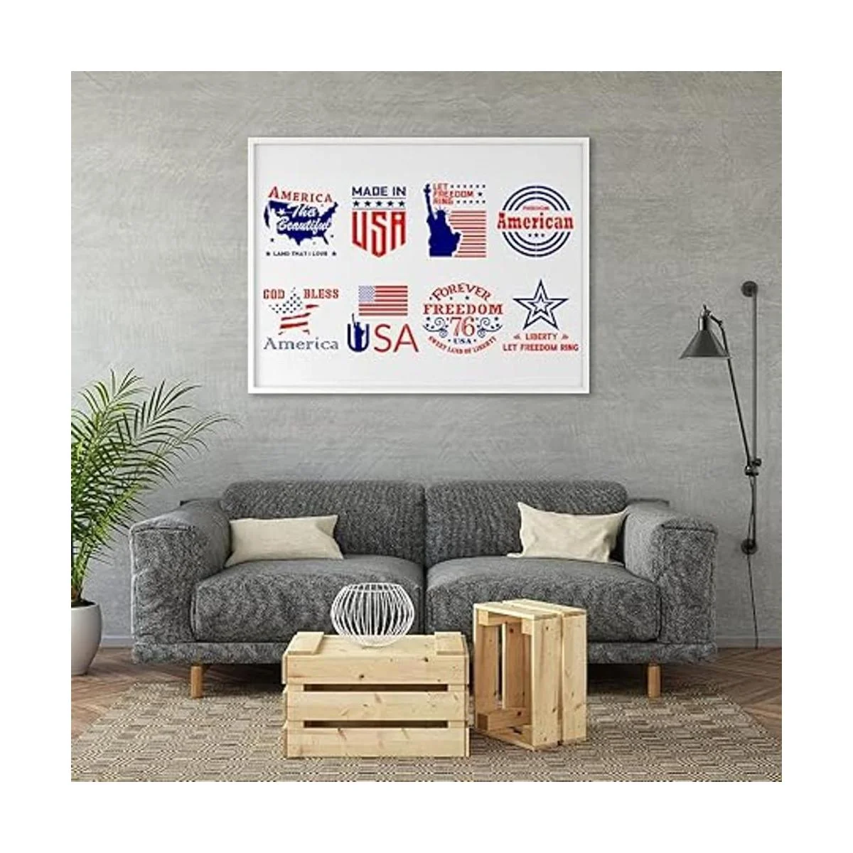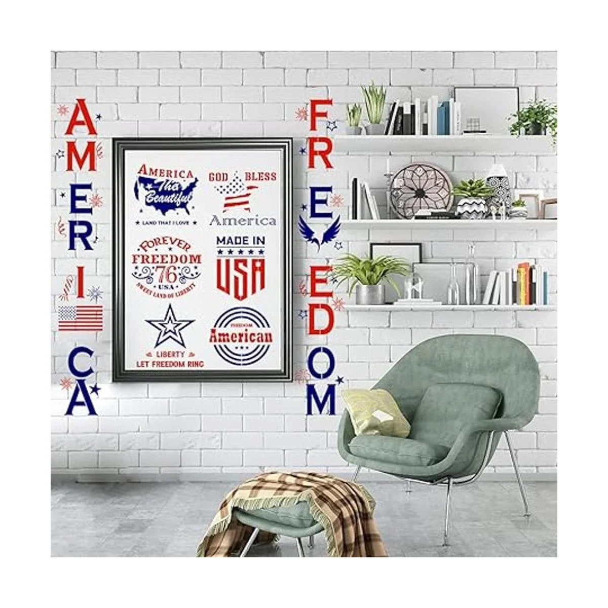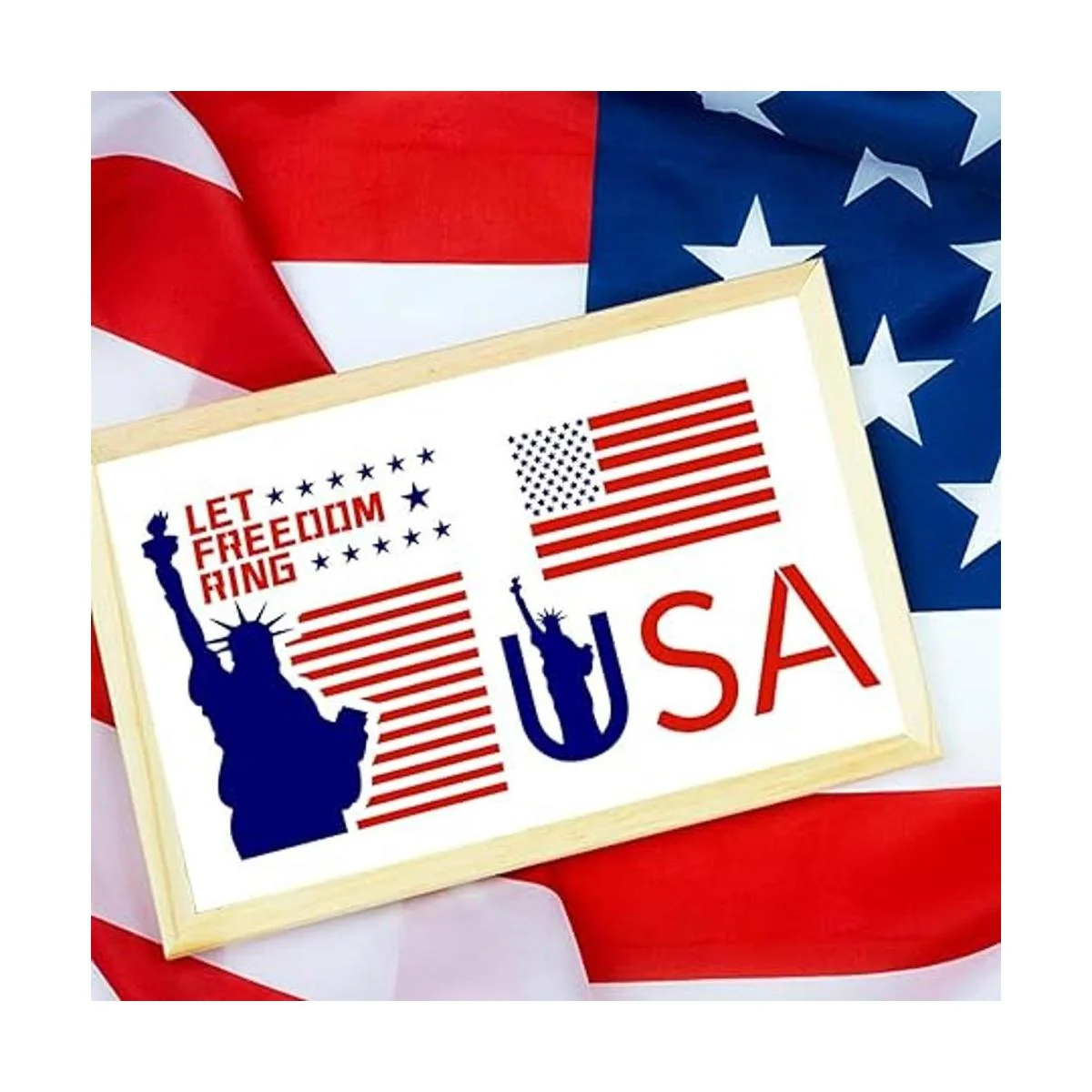 Estilo: esta plantilla estadounidense es sobre tema patriótico, incluyendo la bandera estadounidense, la estatua de la libertad, el mapa de los Estados Unidos y el letrero de porche de letras de los Estados Unidos. Se pueden utilizar para decorar tu hogar y pared.