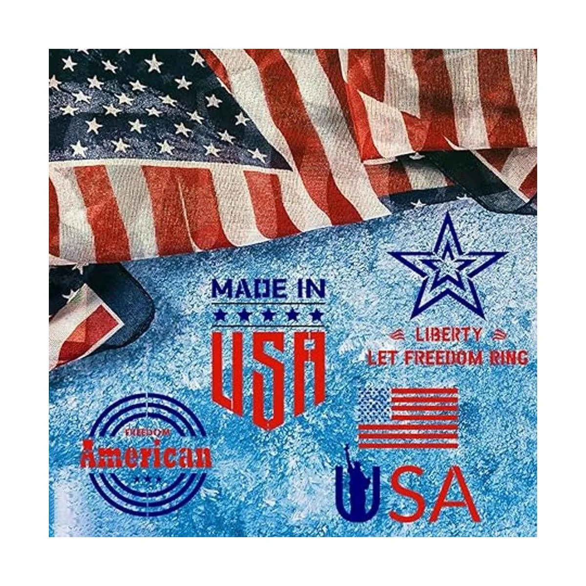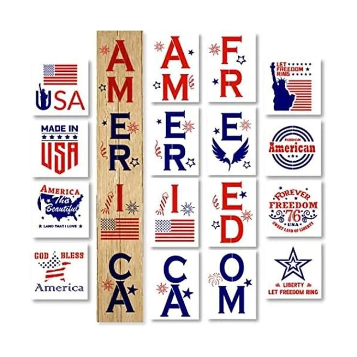 Hying 16 plantillas de plástico patrióticas del 4 de julio para pintar sobre madera, plantilla de bandera estadounidense, plantillas de letras de palabras de Estados Unidos para letrero de porche, palabras del alfabeto, plantillas de dibujo reutilizables de pintura