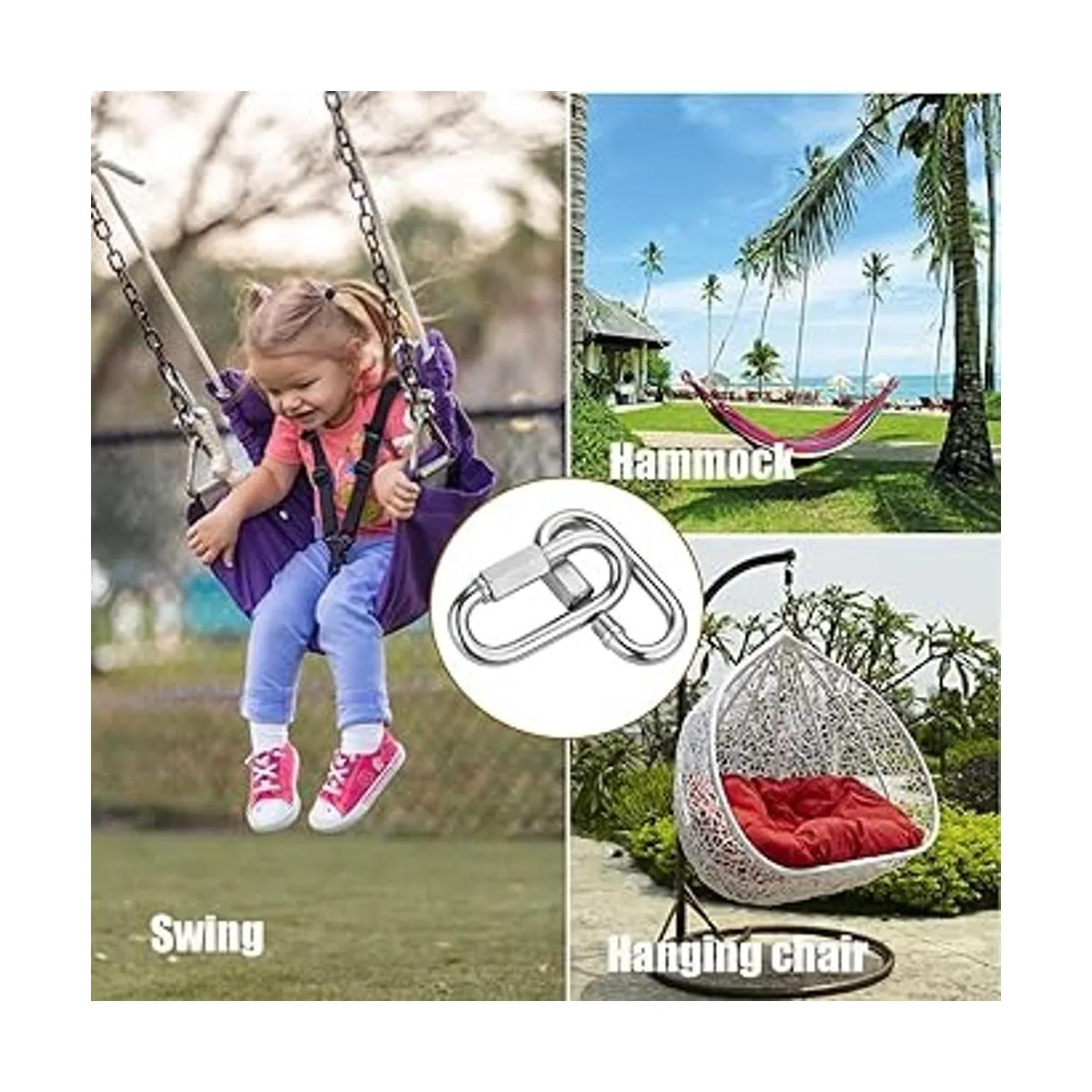 Amplia funcionalidad: estos mosquetones de bloqueo en forma de D son ideales para la vida diaria. Los eslabones rápidos M6 se pueden fijar a la mochila, columpio de porche, bolso, mascotas, llavero, candelabro, luz de cuerda, equipo de fitness. y también se pueden utilizar para actividades al aire libre.