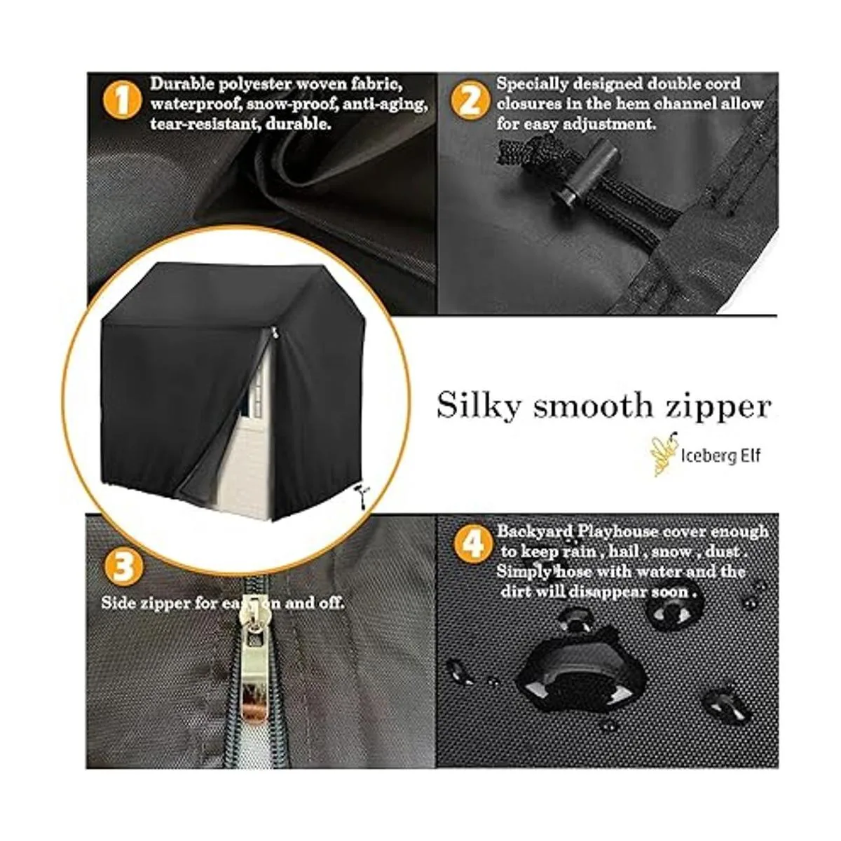 Cubierta de casa de juegos, la parte inferior del diseño de cordón alrededor de un círculo para garantizar un ajuste perfecto entre la funda y tu casa de juegos, no se caerá y no se volará por el viento, la funda es ligeramente más grande, cremallera lateral para poner y quitar fácilmente.