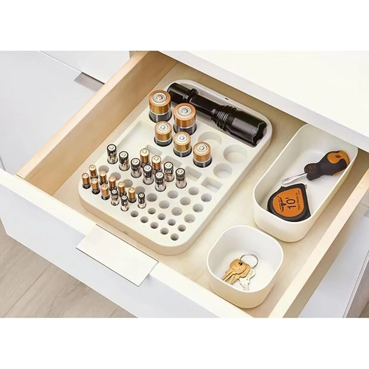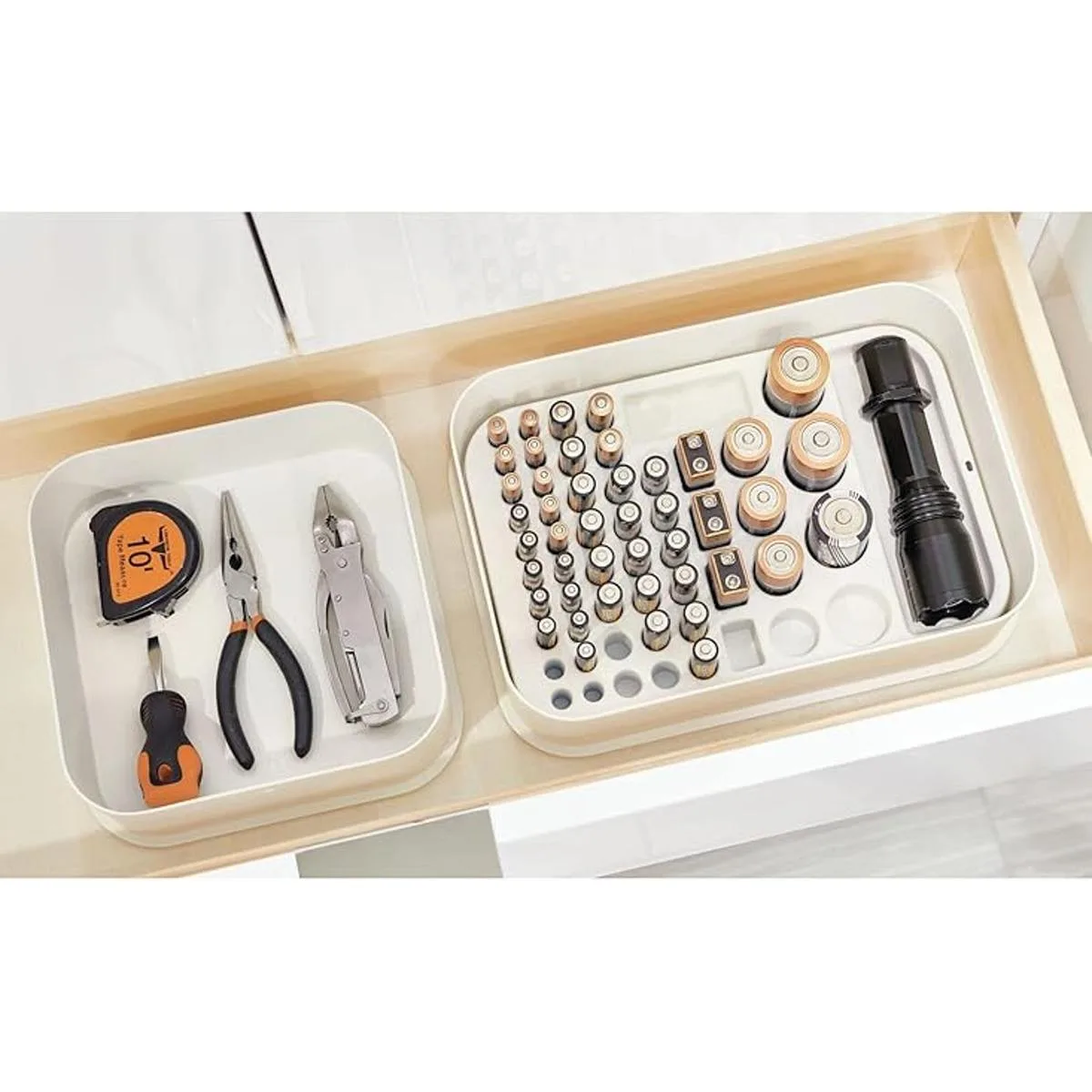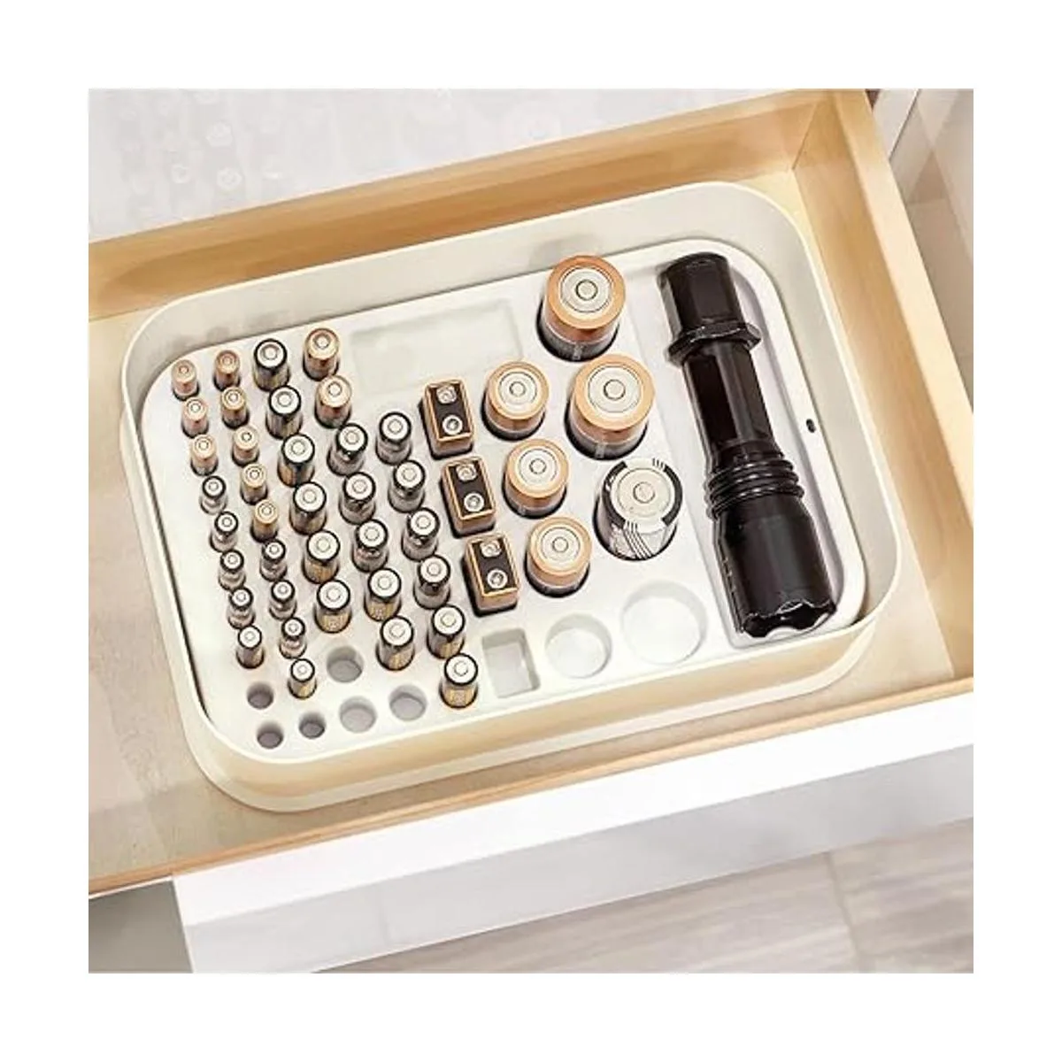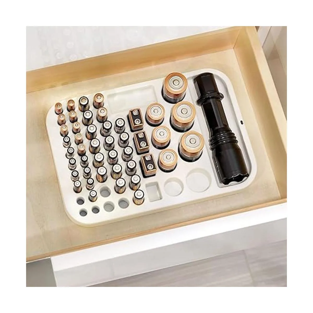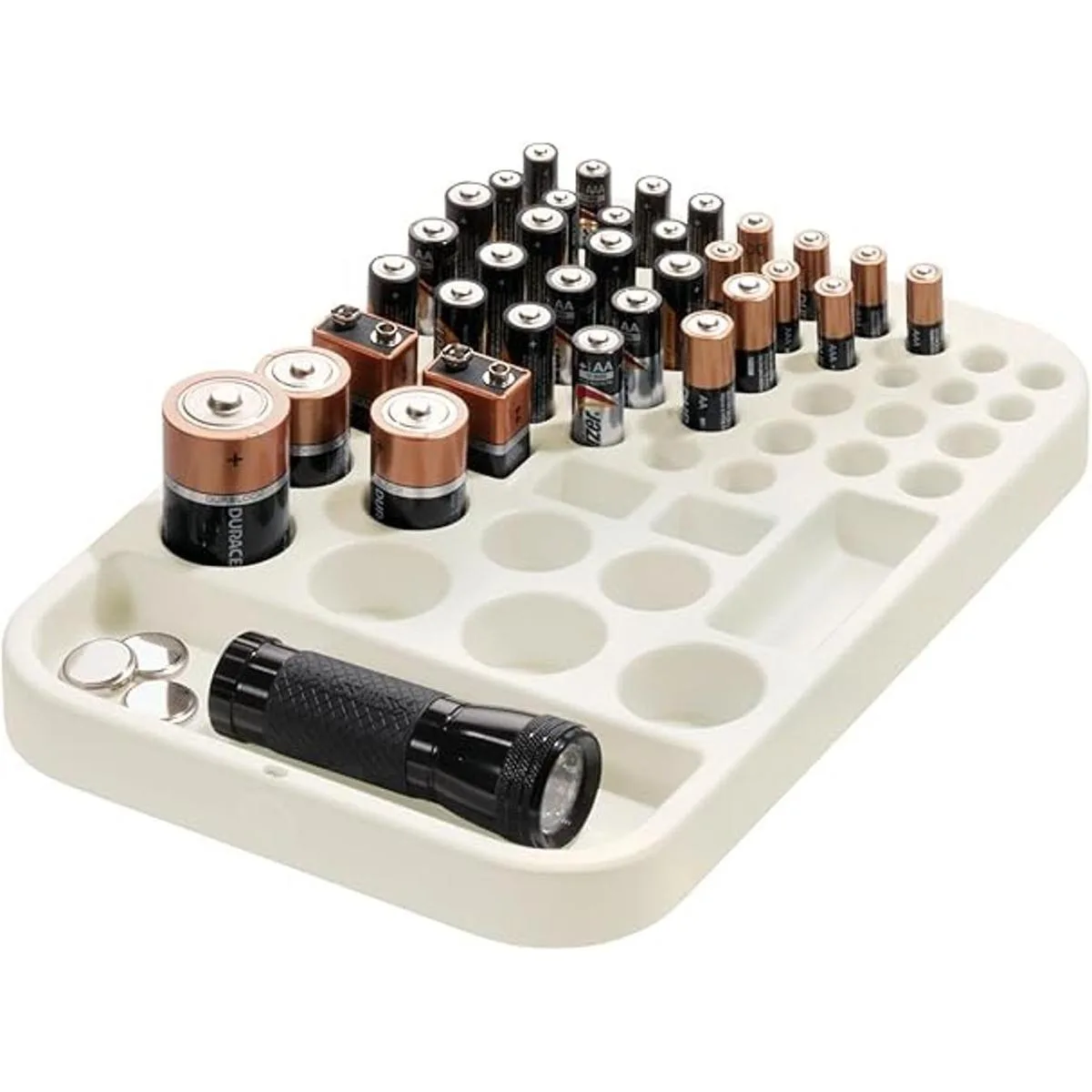 Bandeja de almacenamiento de batería: cuenta con compartimentos divididos en diferentes formas y tamaños para proporcionar almacenamiento una variedad de tipos de baterías comunes, incluyendo AA, AAA, C, D, 9 voltios y botón
