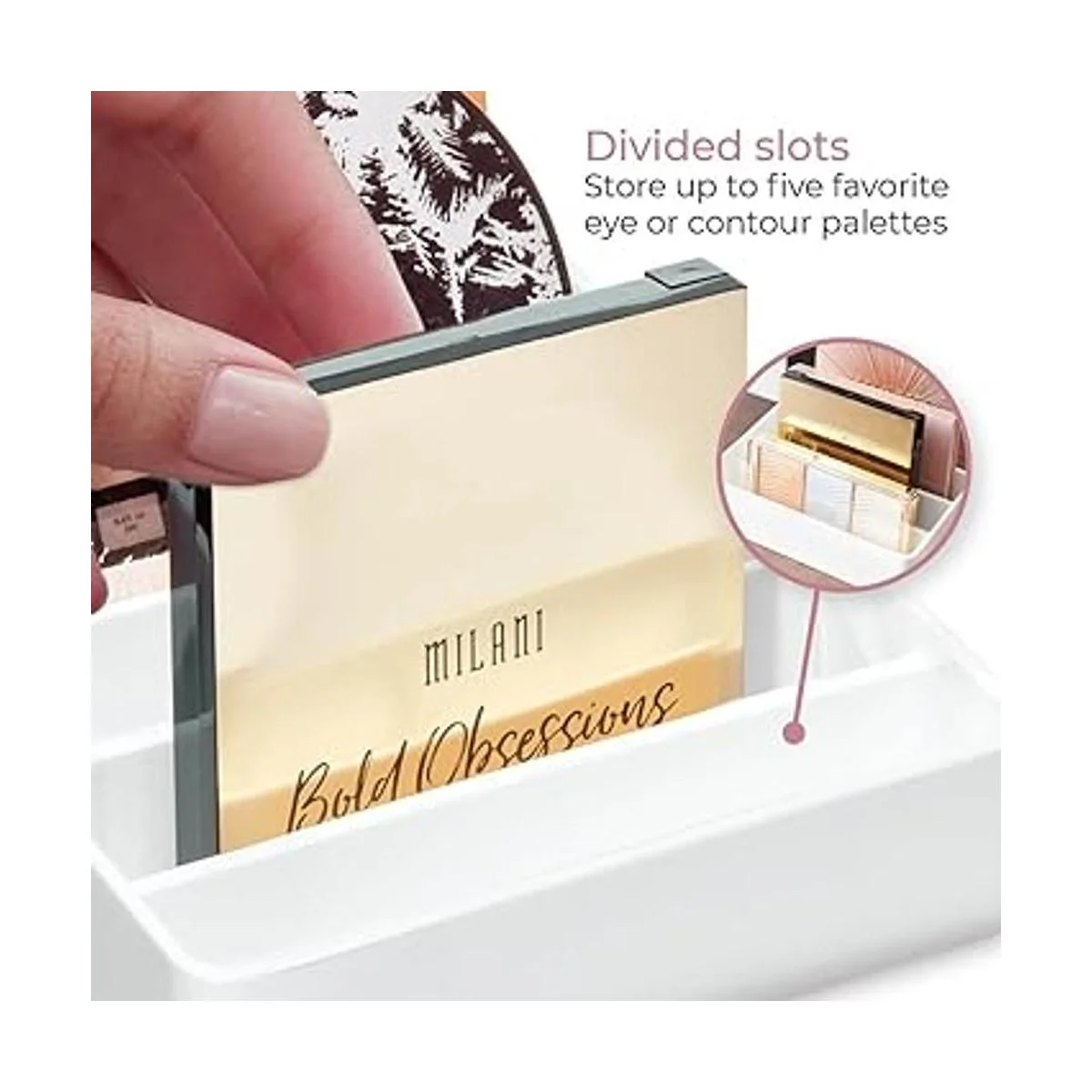 Elegantemente funcional: con 5 ranuras elevadoras divididas, puedes almacenar una variedad de paletas de formas y tamaños variados como paletas de sombras de ojos, paletas de contorno, paletas de rubor, kits de labios, kits de cejas y mucho más.