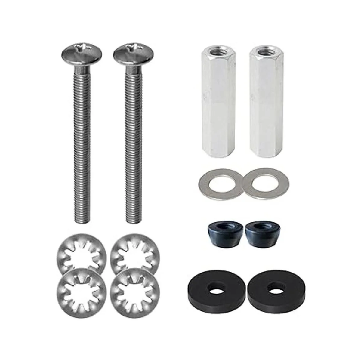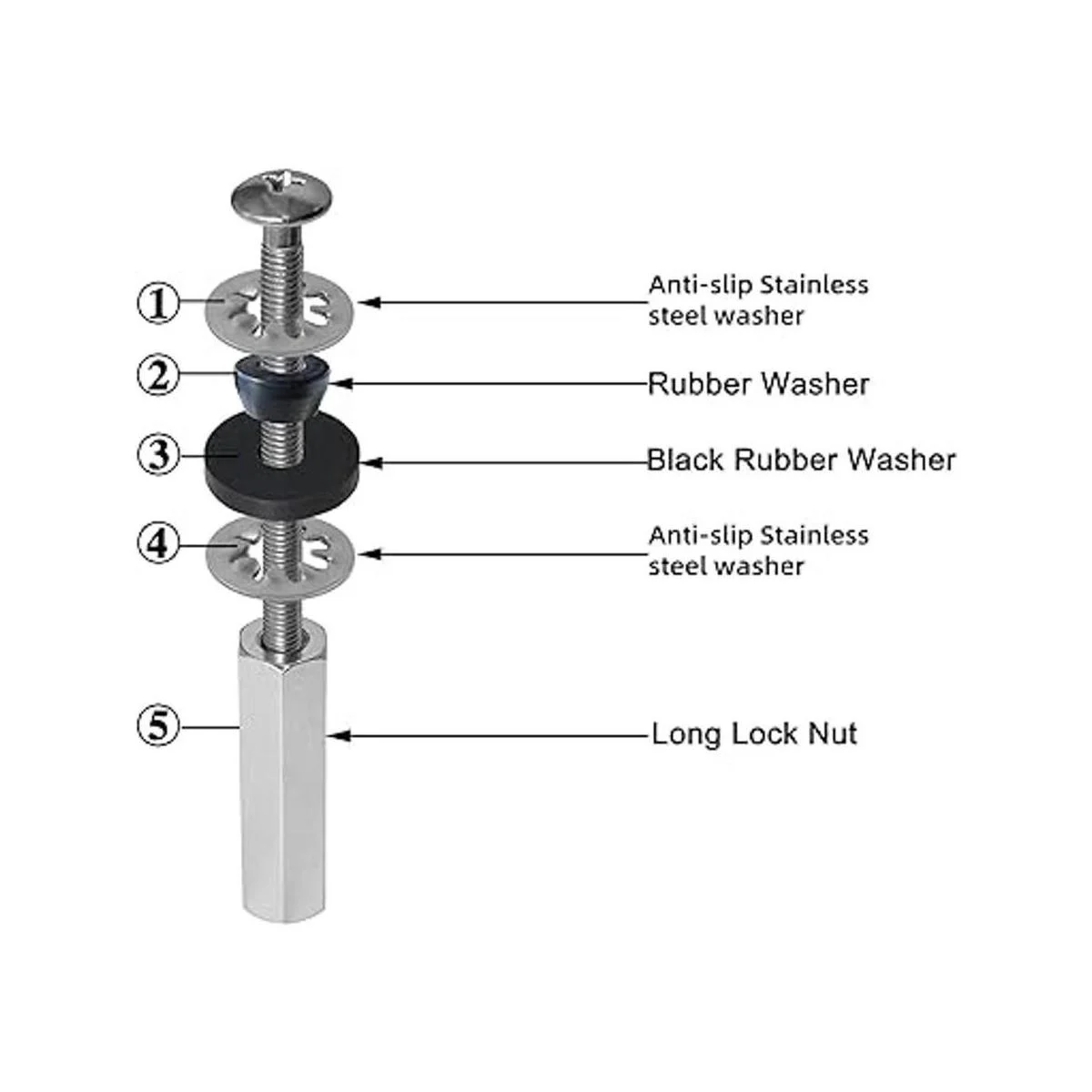 El paquete incluye: 2 pernos de acero inoxidable, 2 tuercas de bloqueo extralargas, 4 arandelas dentadas antideslizantes de acero inoxidable, 4 arandelas de goma negras, 2 arandelas planas. Este es un accesorio perfecto para tu inodoro