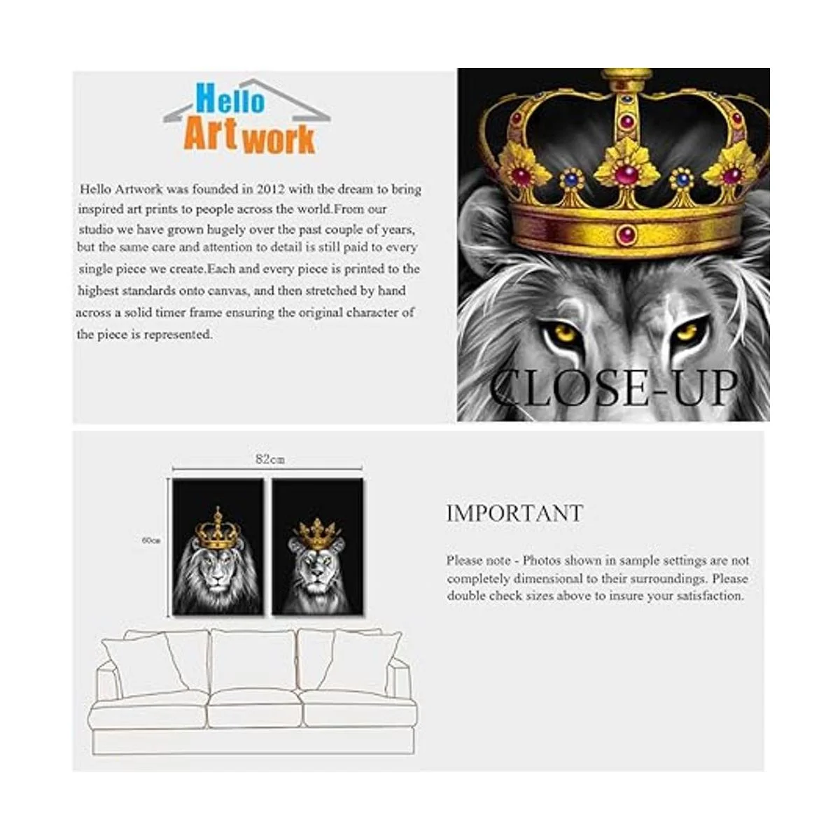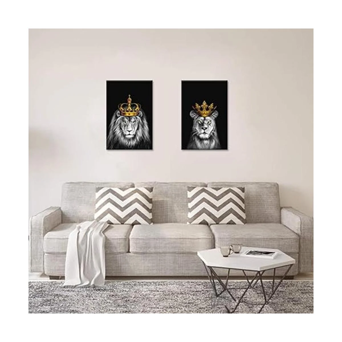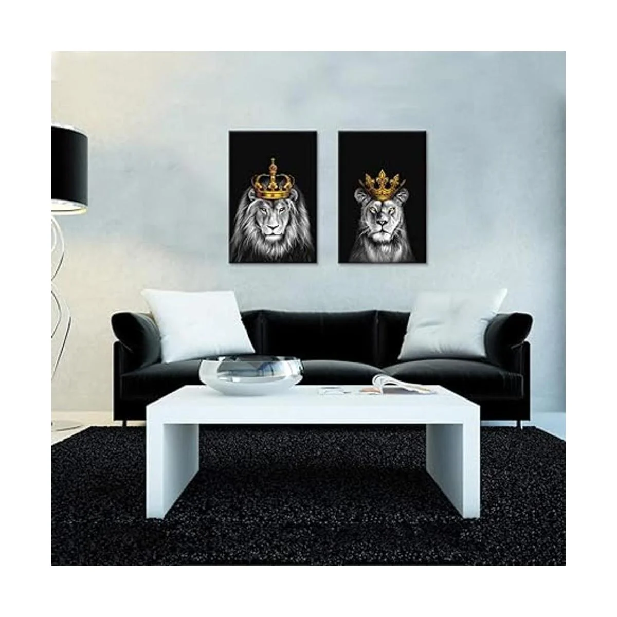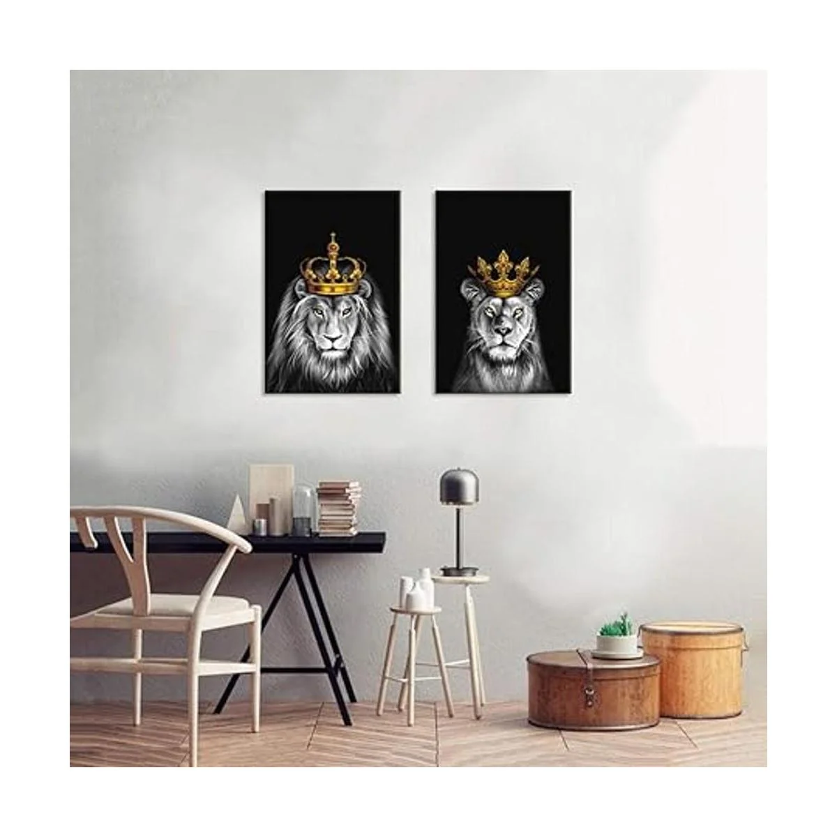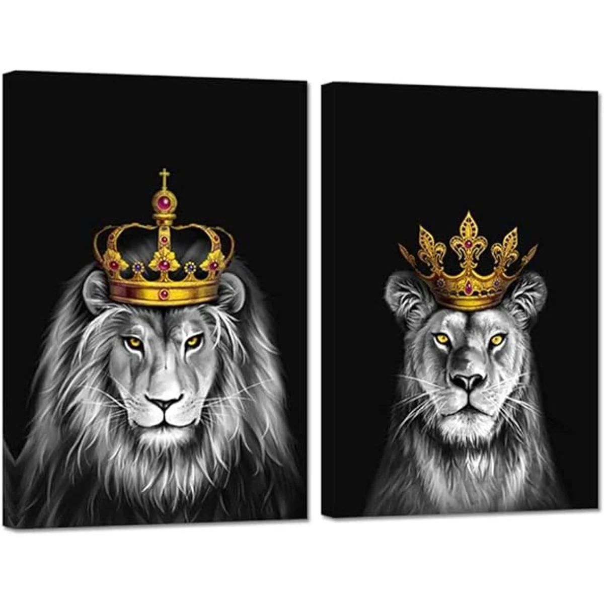 iHAPPYWALL Juego de 2 piezas de lienzo de león y leona león blanco y negro con corona dorada, ilustraciones de animales para dormitorio, decoración del hogar, estirado y enmarcado, listo para colgar, 16 x 24 pulgadas x 2 piezas