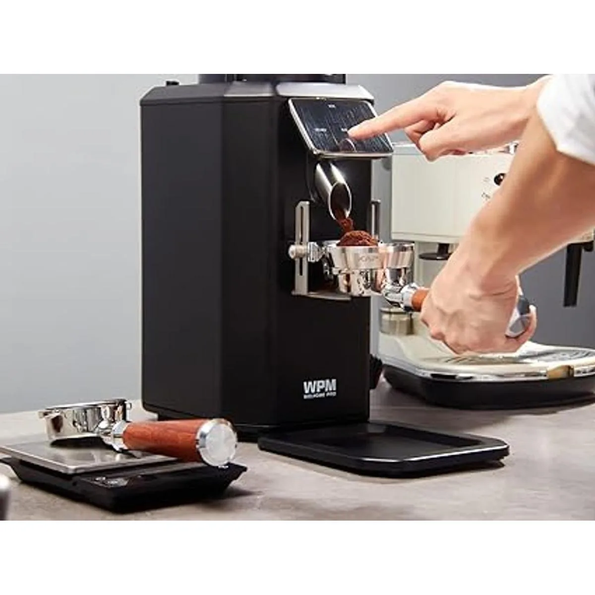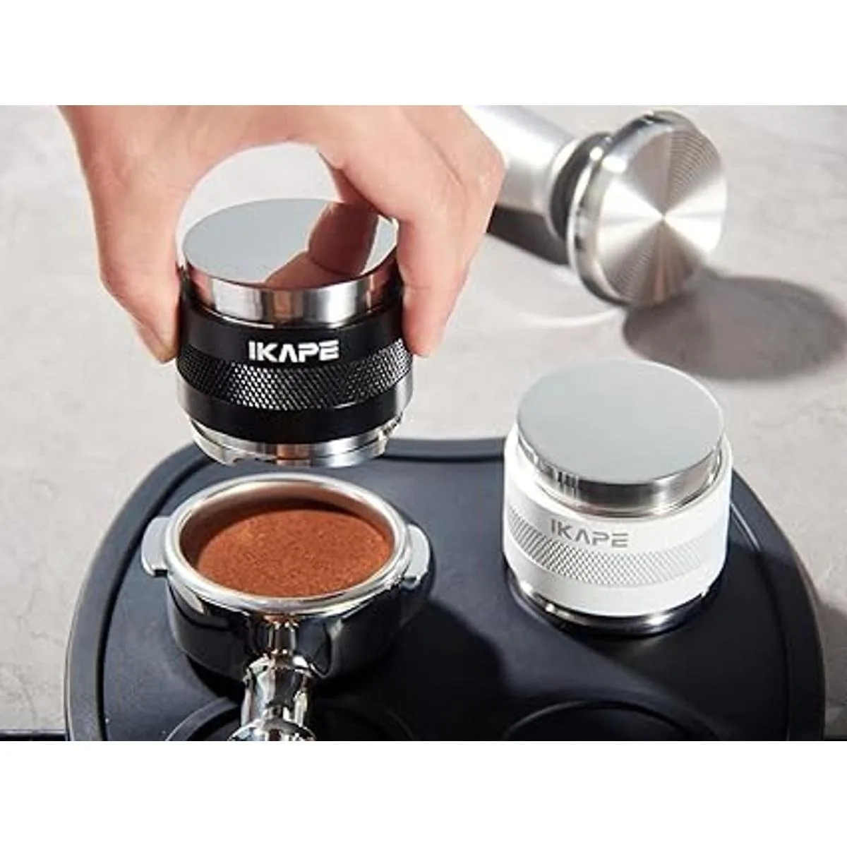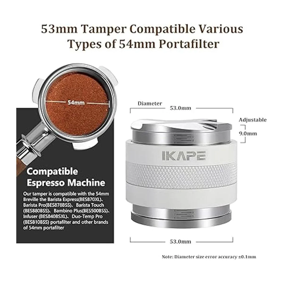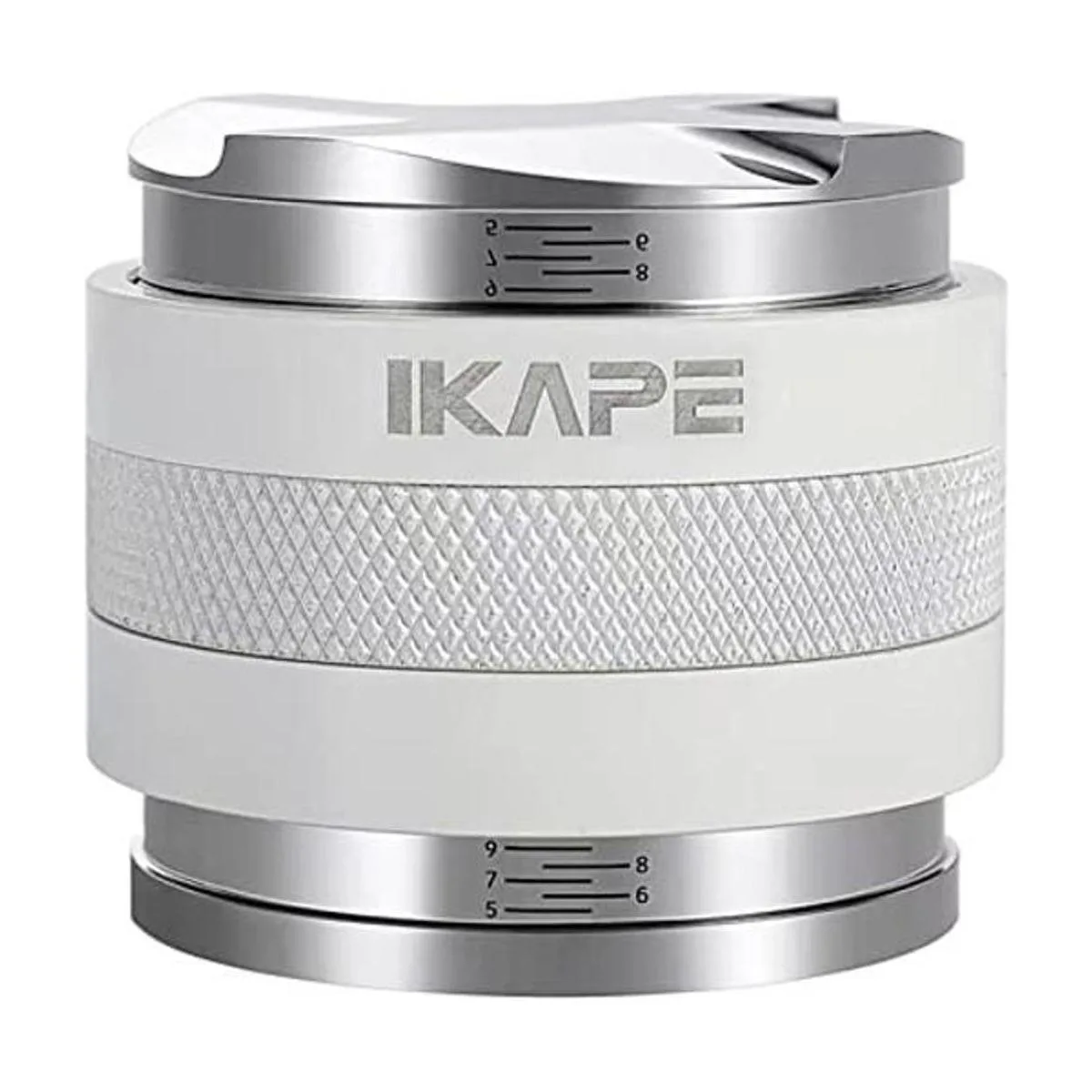 IKAPE Coffee Products, distribuidor de café de 2.087 in y manipulación manual, distribuidor de espresso de profundidad ajustable para todos los portafiltros Espresso de 2.087 in, compatible con portafiltro Breville sin fondo blanco de 2.126 in