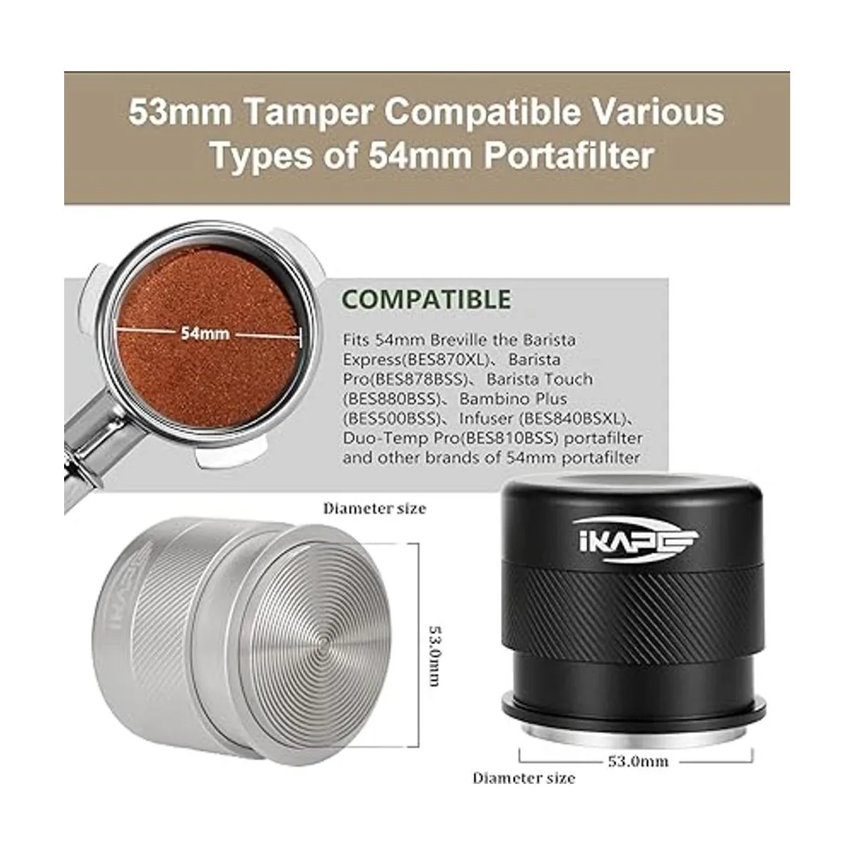 IKAPE Coffee Products, manipulación de expreso de 2.087 in, manipulación de café barista premium con resorte cargado, manipulación 100 de acero inoxidable compatible con portafiltros Breville sin fondo de 2.126 in plata