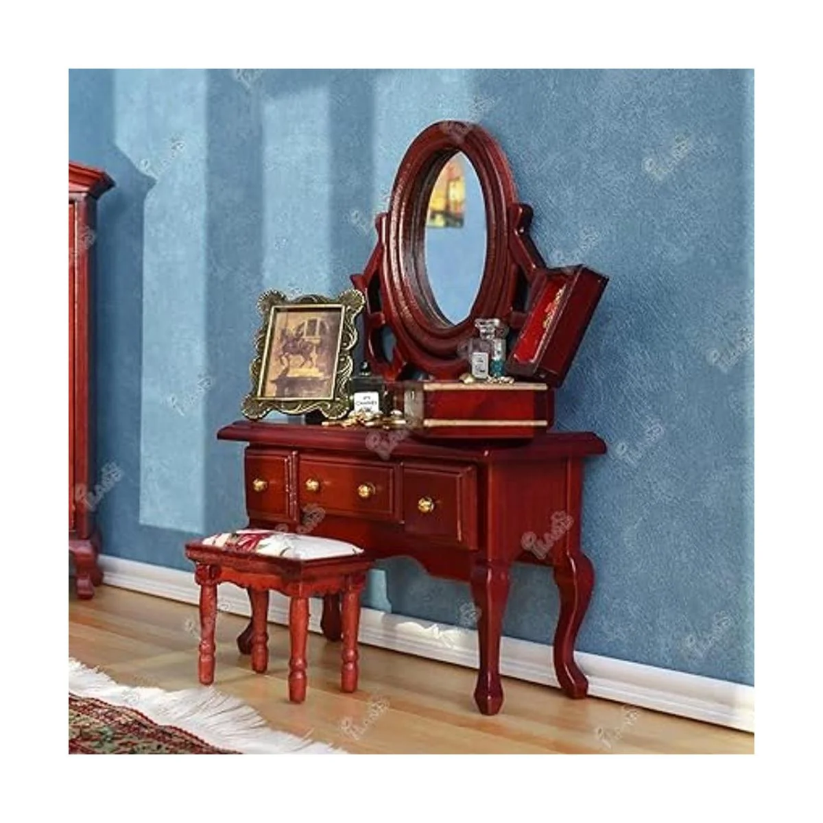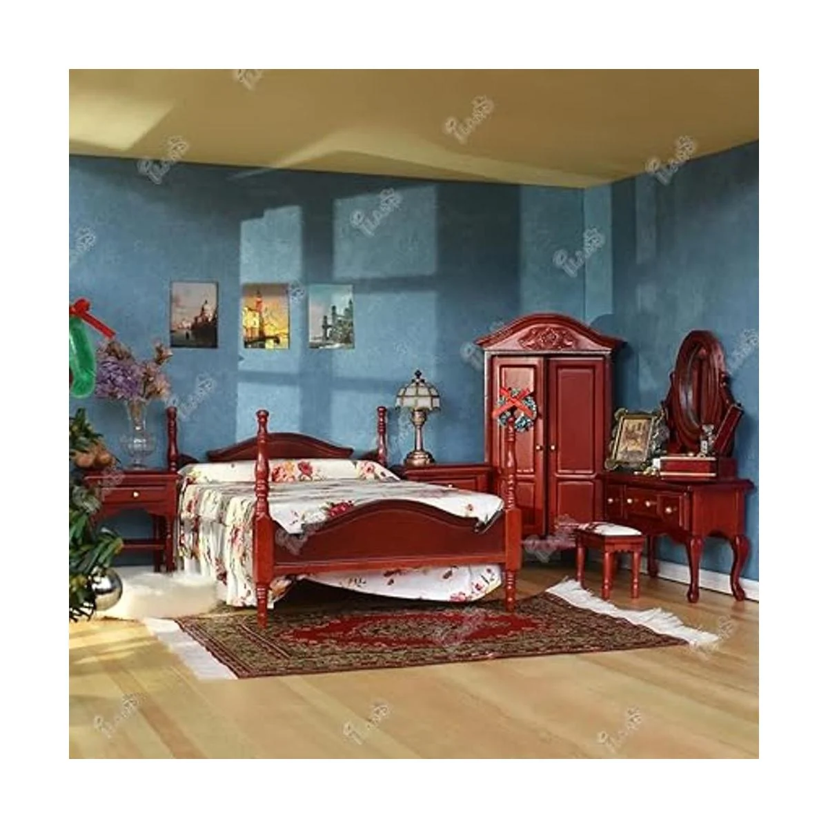 Excelente artesanía: la excelente artesanía de este juego de muebles de casa de muñecas garantiza detalles notables y apariencias casi realistas. Cada cajón y el espejo son móviles. Quedarás impresionado con el perfil clásico de los muebles, el encantador brillo del color caoba y la hermosa ropa de cama floral.