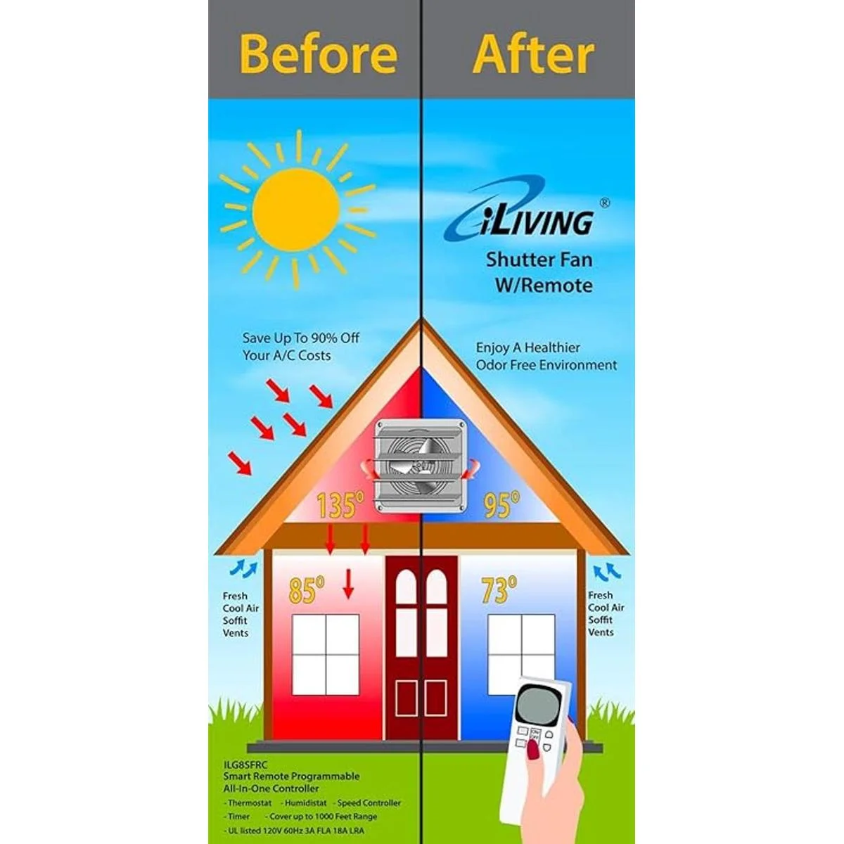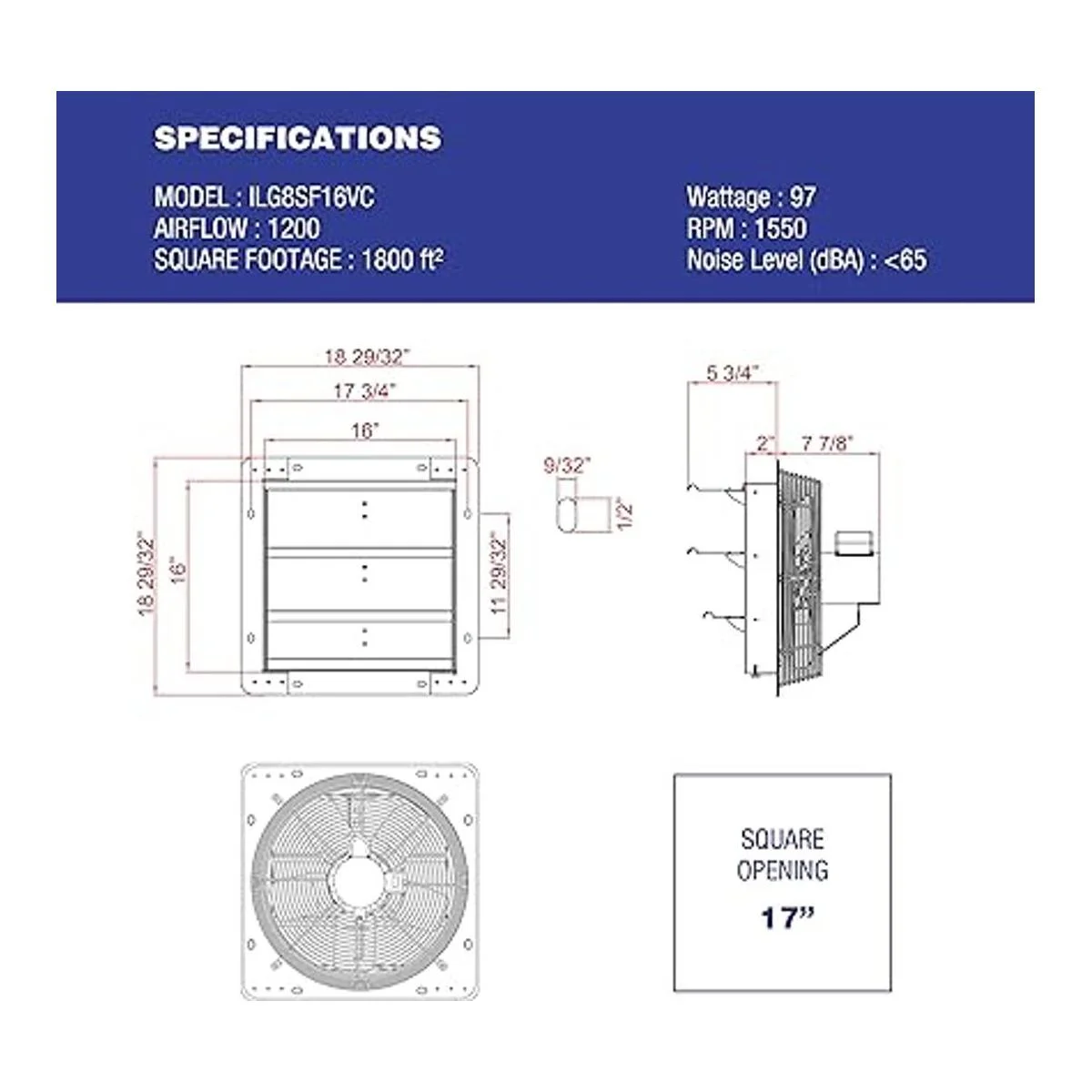 Potente y eficiente: pequeño pero potente, disfrutarás de la potencia y la eficiencia del ventilador de escape con obturador de iLiving. El 16 pulgadas funciona en 120 voltios estándar a 1/20 HP, 0.85 amperios con 1550 rotaciones por minuto, refrigeración y ventilación un área de 1200 pies cúbicos por minuto.