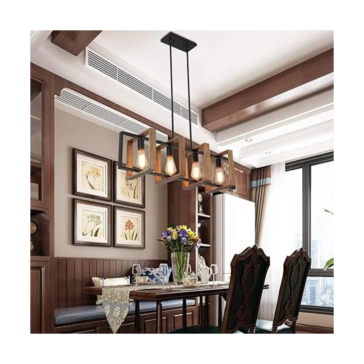 Moderno y granja: crea un ambiente acogedor y cómodo para el hogar con la lámpara de araña lineal rústica de la colección Briarwood inspirada en la granja, especialmente diseñada para iluminar el corazón de tu cocina, comedor o lugares de estilo industrial. El marco de madera calada y metal añade un toque rústico vintage a tu espacio, cuenta con una construcción de madera con acabado rústico, diseñada para lanzar una luz ambiental suave sobre tu habitación.