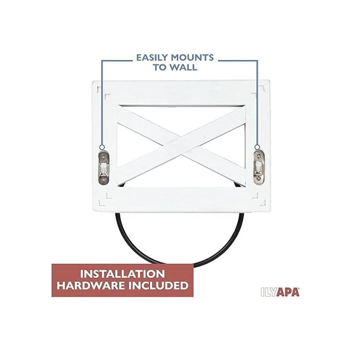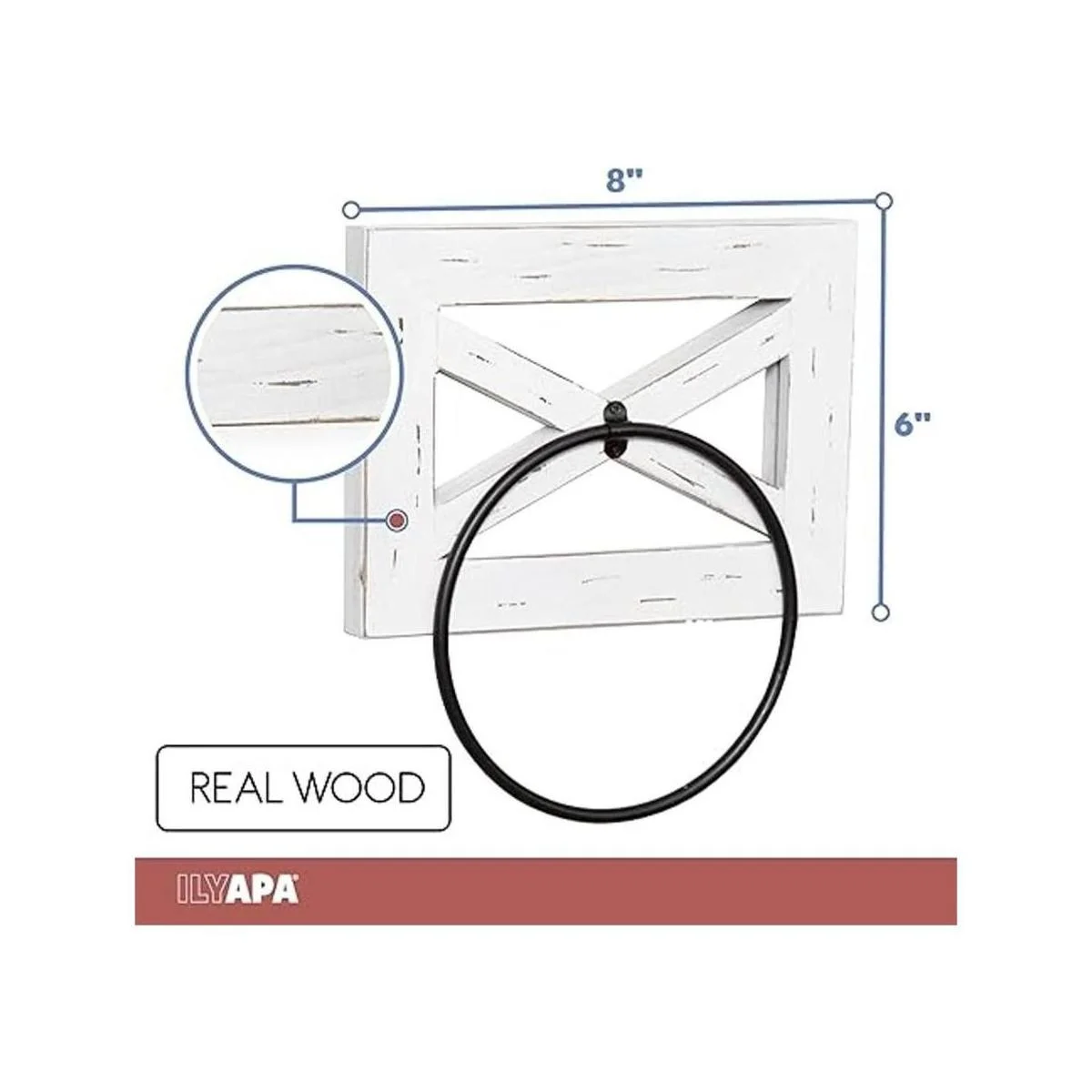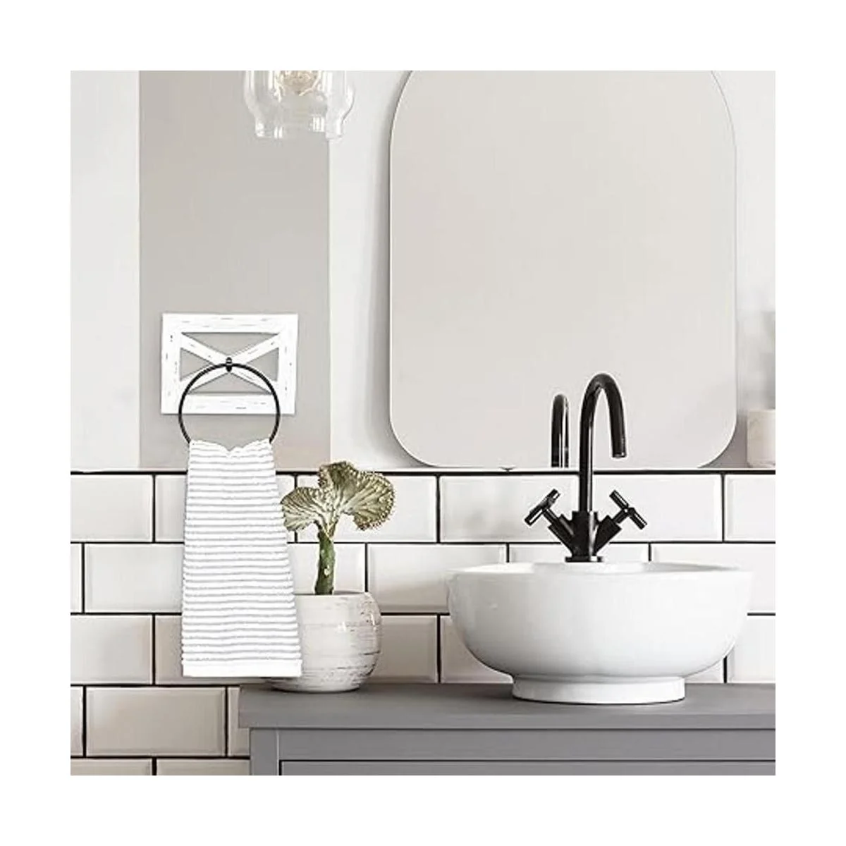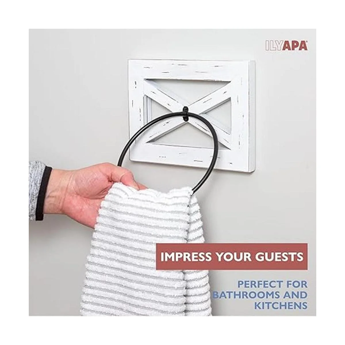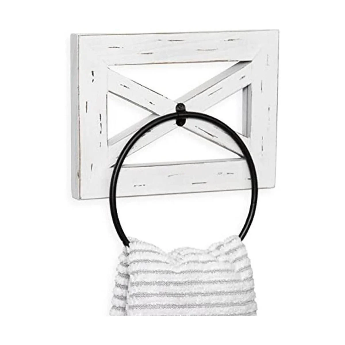 Ilyapa Anillo de toalla de mano rústico para baño, soporte de toalla de mano para baño, madera blanca y metal negro, decoración de granja