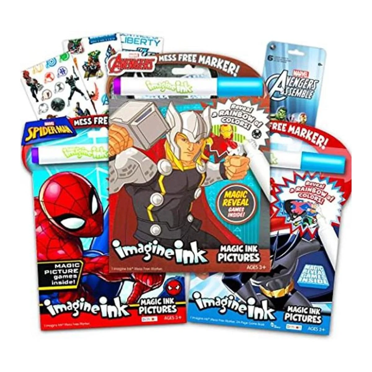 Imagine Ink Juego de 3 libros de actividades con imágenes mágicas de superhéroes, de la Liga de la Justicia, Batman, Spiderman y Vengadores, con paquete de calcomanías libros para colorear libres de desorden para niños pequeños