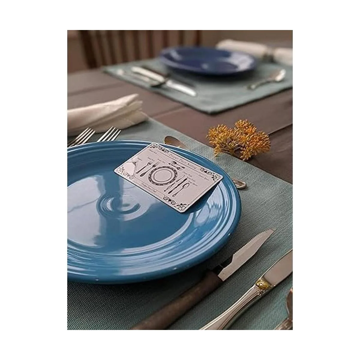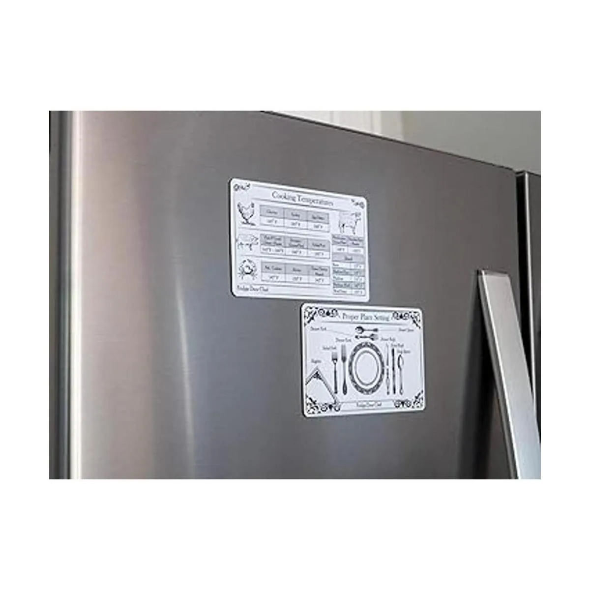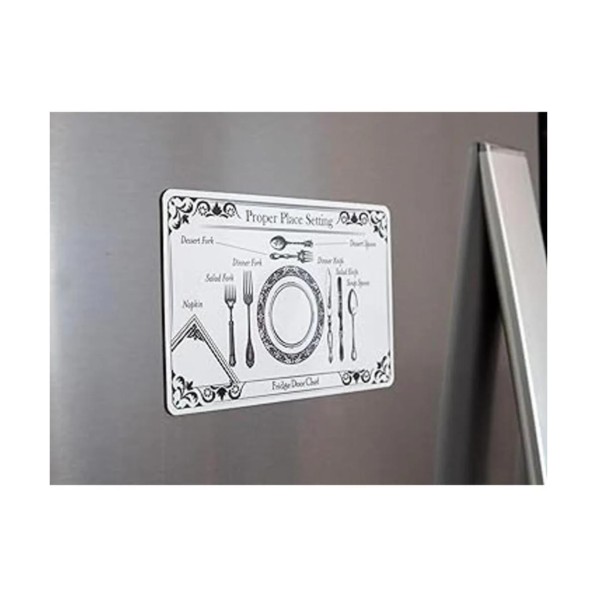 Imán de regalo. Esto incluye un imán que muestra un ajuste de lugar adecuado. Un aspecto elegante que va bien en tu nevera y te recordará que pongas los tenedores en el lado izquierdo del plato cuando tus invitados se presenten para la cena.