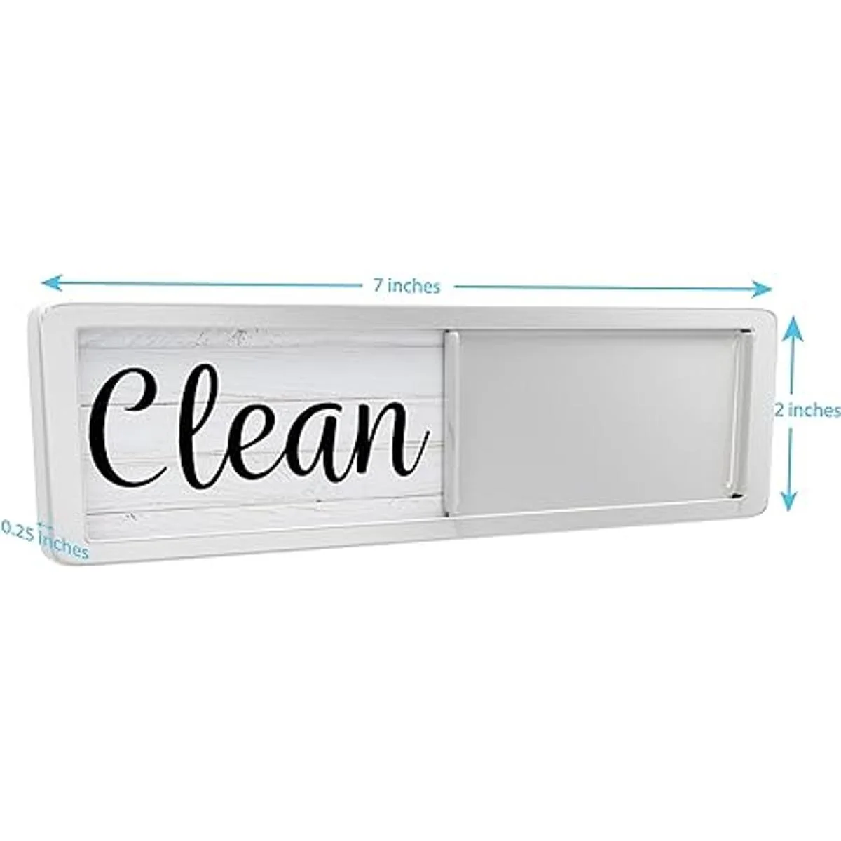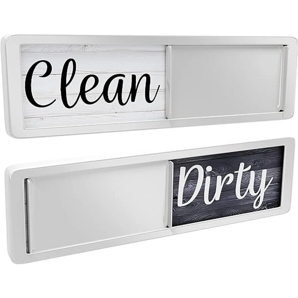 Letrero magnético para lavavajillas con texto en inglés Clean Dirty Mide 7 x 2 pulgadas, se desliza suavemente y tiene el diseño atemporal de madera blanca y negra protegido por una ventana acrílica transparente con un borde plateado. Los imanes fuertes con diseños rústicos de rae dunn son complementarios a cualquier decoración de cocina.